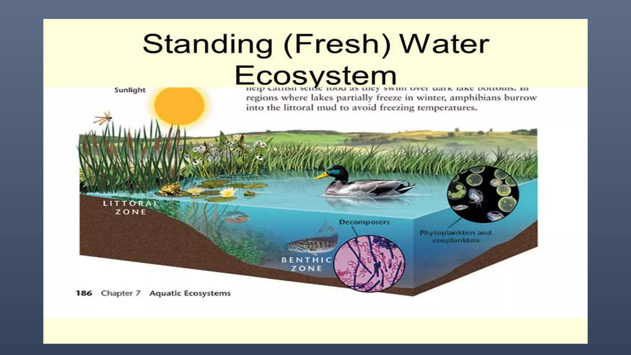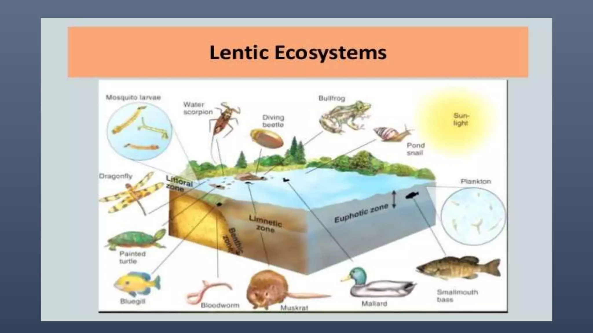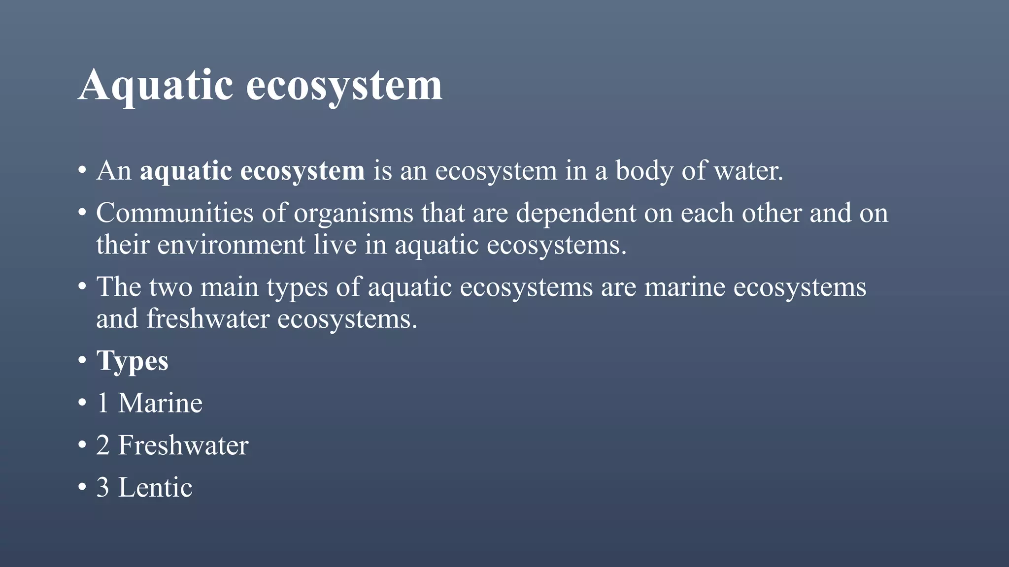 There are two main types of aquatic ecosystems: marine ecosystems, which cover 71% of the Earth's surface, and freshwater ecosystems, which cover 0.78%. Freshwater ecosystems can be divided into lentic (slow moving water like ponds and lakes) and lotic (faster moving water like streams and rivers). Wetlands are a type of freshwater ecosystem dominated by plants adapted to saturated soil, including swamps, marshes, fens, and bogs. Aquatic ecosystems perform important functions like recycling nutrients, purifying water, providing habitat, and are used for tourism.