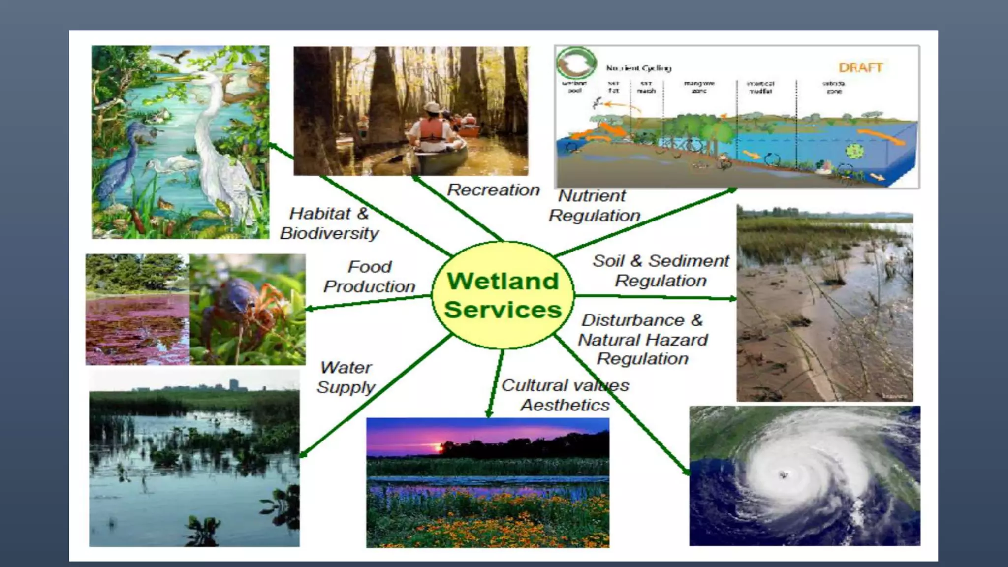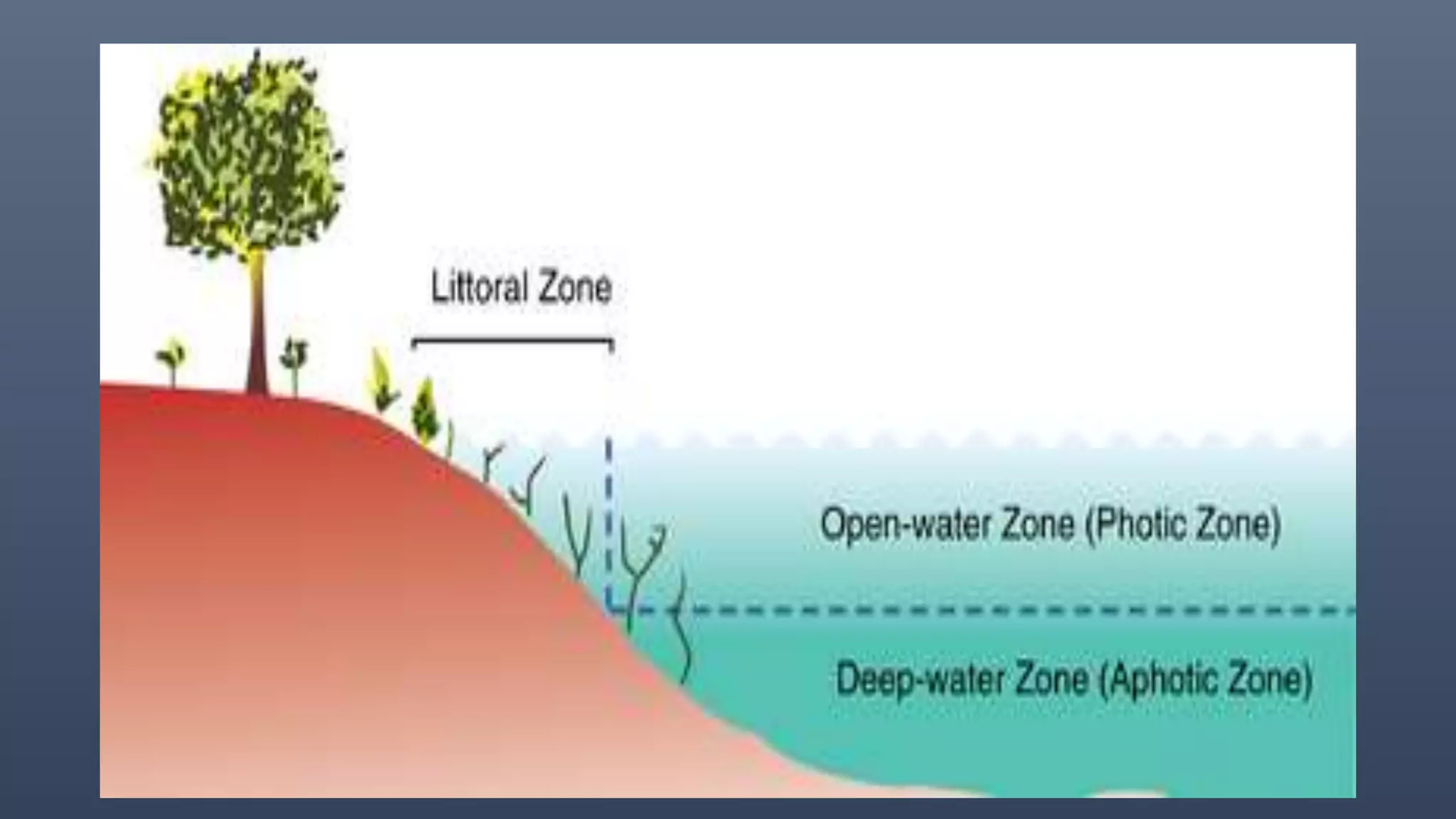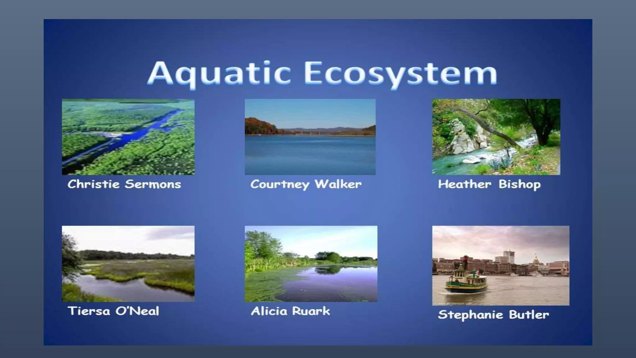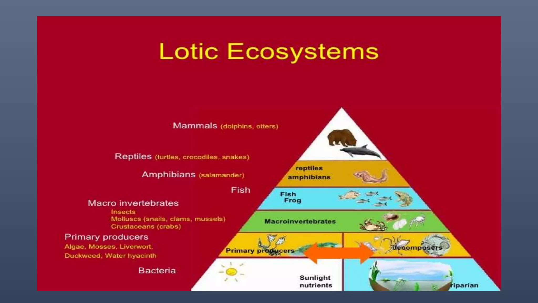 There are two main types of aquatic ecosystems: marine ecosystems, which cover 71% of the Earth's surface, and freshwater ecosystems, which cover 0.78%. Freshwater ecosystems can be divided into lentic (slow moving water like ponds and lakes) and lotic (faster moving water like streams and rivers). Wetlands are a type of freshwater ecosystem dominated by plants adapted to saturated soil, including swamps, marshes, fens, and bogs. Aquatic ecosystems perform important functions like recycling nutrients, purifying water, providing habitat, and are used for tourism.