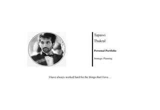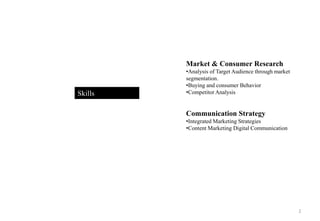 The document discusses Tapasvi Thakral's experience in strategic planning, market and consumer research, and communication strategy for the fashion industry. It highlights their skills in identifying customer needs, analyzing competitors, interpreting market positioning, and developing integrated marketing strategies. Several sections provide examples of Tapasvi's work analyzing target audiences, social media strategies, website recommendations, and fashion trends for various brands. The document demonstrates Tapasvi's qualifications and skills in areas like market research, communication, branding, and project management in the luxury fashion and hospitality industries.