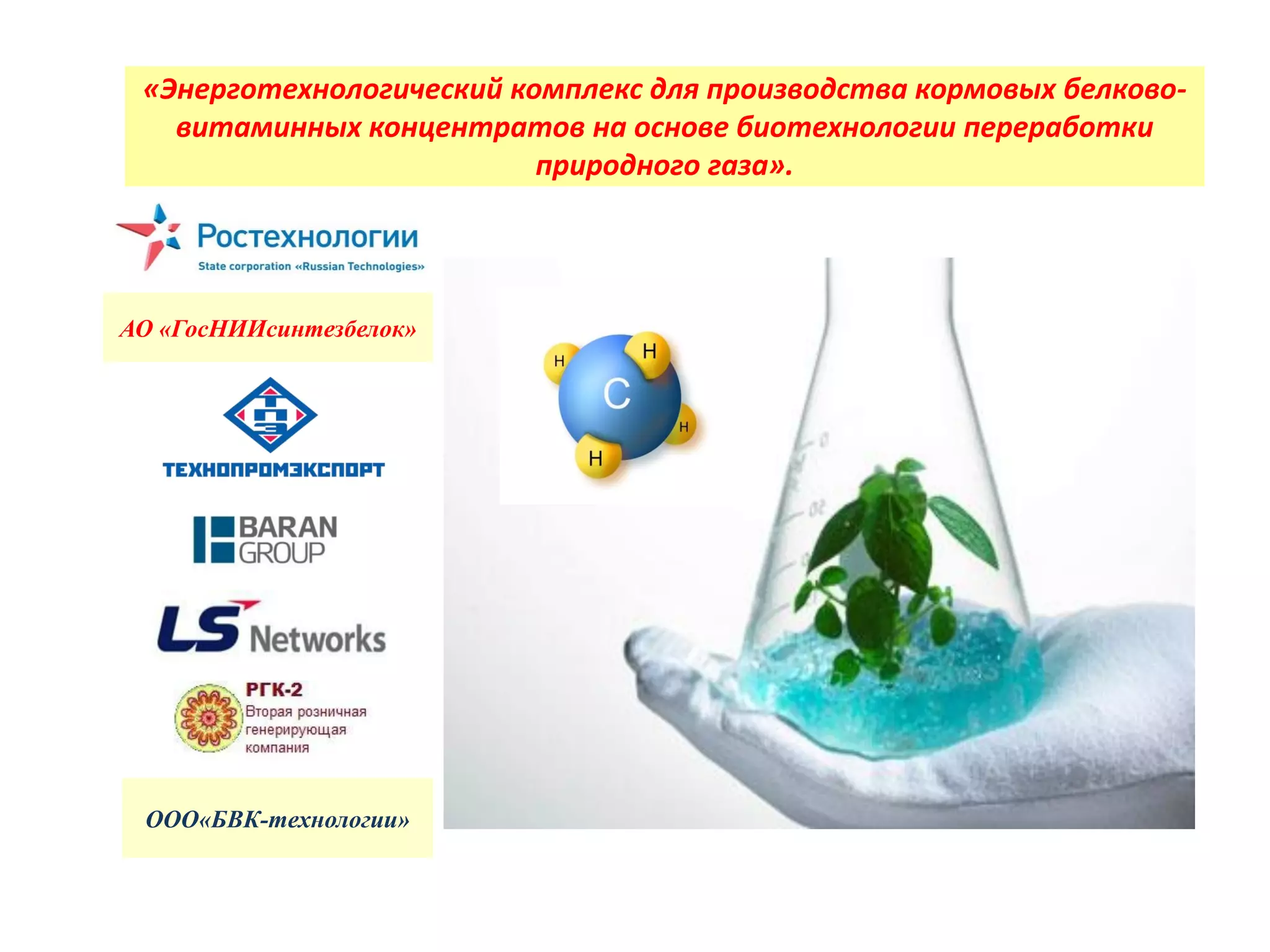 Документ описывает проект создания энерготехнологического комплекса для производства кормовых белково-витаминных концентратов из биомассы микробного белка, получаемого из природного газа. Указаны текущие достижения, потребности рынка, этапы реализации проекта, финансирование, а также ключевые участники. Цель проекта - частичное замещение рыбной муки и обеспечение устойчивого бизнеса путем разработки конкурентоспособной продукции.
