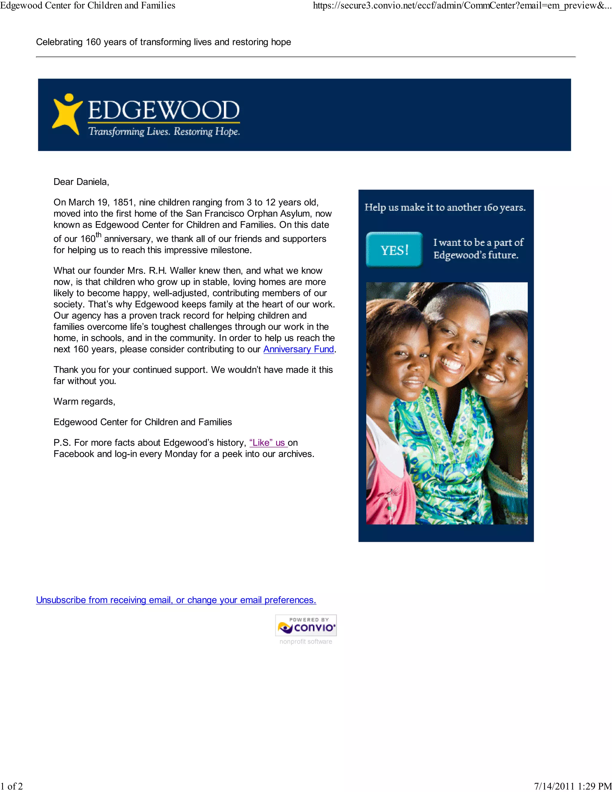 On March 19, 1851 nine orphaned children moved into the first home of what is now known as Edgewood Center for Children and Families, marking the organization's 160th anniversary. Edgewood helps children and families overcome challenges through programs in homes, schools, and communities based on the belief that stable, loving homes create well-adjusted members of society. The letter requests support for the Anniversary Fund to help Edgewood continue its mission for the next 160 years.