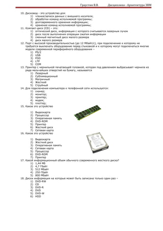 Документ представляет собой тест по теме устройства компьютера, состоящий из двух вариантов вопросов с множественным выбором ответов. Вопросы охватывают основные компоненты компьютера, их функции и характеристики, включая устройства ввода/вывода, типы памяти, процессоры и внешние носители информации. Каждый вопрос предлагает несколько вариантов ответов, среди которых необходимо выбрать правильный.