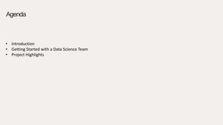 The document discusses the benefits and challenges of building an in-house data science team at OSF Healthcare. It provides examples of projects the team has worked on, including readmission models, cost and utilization models, staffing simulation, and natural language processing. The benefits of an in-house team include higher performance, lower costs, full transparency and IP ownership. Challenges include internal resistance, implementation risks, and defining rules for model use. The document outlines the team's structure, basic project approach, and strategies for ongoing success, such as project intake processes and focus on foundational elements.