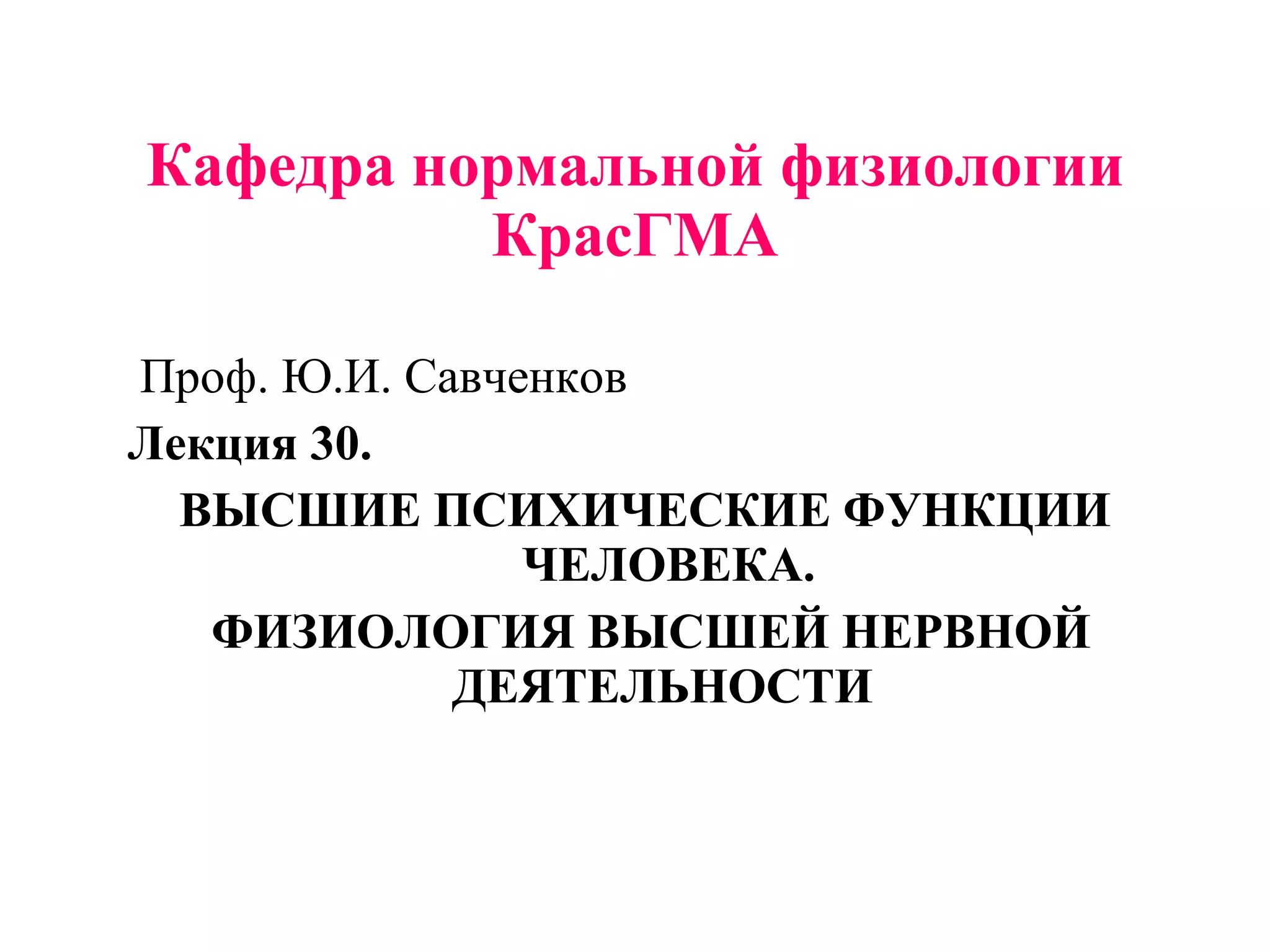 Документ содержит лекцию о высших психических функциях человека и физиологии высшей нервной деятельности, включая концепции сознания и уровни активации психической деятельности. Рассмотрены врожденные и приобретенные формы поведения, а также механизмы научения и формирования условных рефлексов. Также обсуждаются виды памяти и теории ее работы, основанные на различных физиологических механизмах.