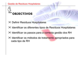 Este documento discute a gestão de resíduos hospitalares no Portugal. Ele define resíduos hospitalares, classifica-os em quatro grupos dependendo do seu nível de periculosidade, e descreve os passos para a correta gestão dos mesmos, incluindo produção e recolha, armazenamento, registro, transporte e eliminação.