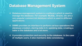 This document discusses database management systems (DBMS). It defines a DBMS as software that manages databases and provides interfaces for creating, storing, updating, and securing data. The document outlines the key functions of a DBMS, including data definition, updation, retrieval, and user administration. It also discusses the characteristics, advantages, disadvantages, popular types (hierarchical, network, relational, object-oriented), software, and applications of DBMS.