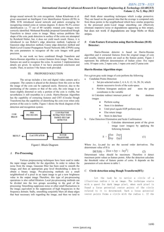 This document describes a coin recognition system that uses the Harris-Hessian algorithm and Hough transform. It begins by discussing the need for automatic coin recognition systems and describes existing approaches. It then presents the Harris-Hessian algorithm, which extracts features from coin images to identify coins. The algorithm involves preprocessing images, detecting interest points using Harris-Hessian, and identifying circles using Hough transform. The goal is to recognize Indian coins, group them by features, distinguish between coins of the same group, count the coins, and calculate the total value.