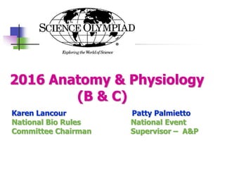 This document provides information about the anatomy and physiology event rules for the 2016 competition season. It begins with a disclaimer noting that the rules are still in draft form. The main topics covered in the event for 2016 will be the skeletal, muscular, and integumentary systems. The document then provides more detailed information about the skeletal and muscular systems, including bone and muscle anatomy, types of bones and muscles, and key structures and functions. It also lists some common disorders that may be included.