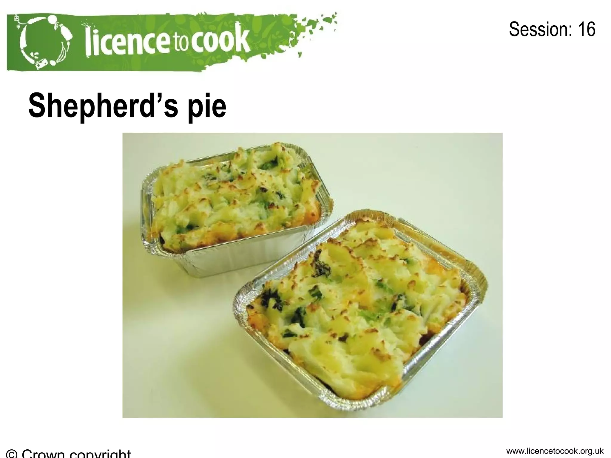 This document provides a recipe for Shepherd's pie. It lists the ingredients as minced lamb, onions, carrots, potatoes, cabbage, flour, tomato puree, Worcestershire sauce, stock, and milk. The method involves cooking the potatoes, browning the lamb and vegetables, making a sauce by adding flour and seasonings to the lamb mixture, mashing the potatoes with milk, layering the meat sauce and mashed potatoes in a dish, and baking for 20-25 minutes until golden brown. Variations mentioned are adding other vegetables to the meat layer or using vegetable mince for a vegetarian option.