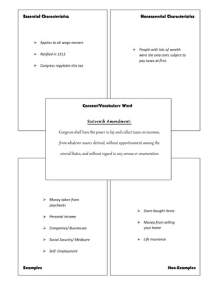The document discusses the essential and nonessential characteristics of income taxation as outlined in the Sixteenth Amendment, ratified in 1913. It specifies that all wage earners are subject to income tax on various sources of income, including personal income and business profits. Additionally, it highlights examples of income while noting that wealth alone does not equate to taxable income.