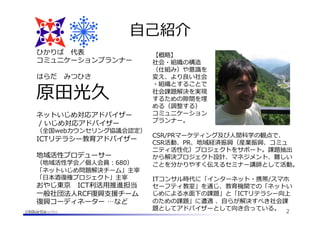 ⾃自⼰己紹介 ひかりば 代表 コミュニケーションプランナー はらだ みつひさ 原⽥田光久 ネットいじめ対応アドバイザー / いじめ対応アドバイザー (全国webカウンセリング協議会認定) ICTリテラシー教育アドバイザー 地域活性プロデューサー (地域活性学会/個⼈人会員:680) 「ネットいじめ問題解決チーム」主宰 「⽇日本酒復復権プロジェクト」主宰 おやじ東京 ICT利利活⽤用推進担当 ⼀一般社団法⼈人RCF復復興⽀支援チーム 復復興コーディネーター
