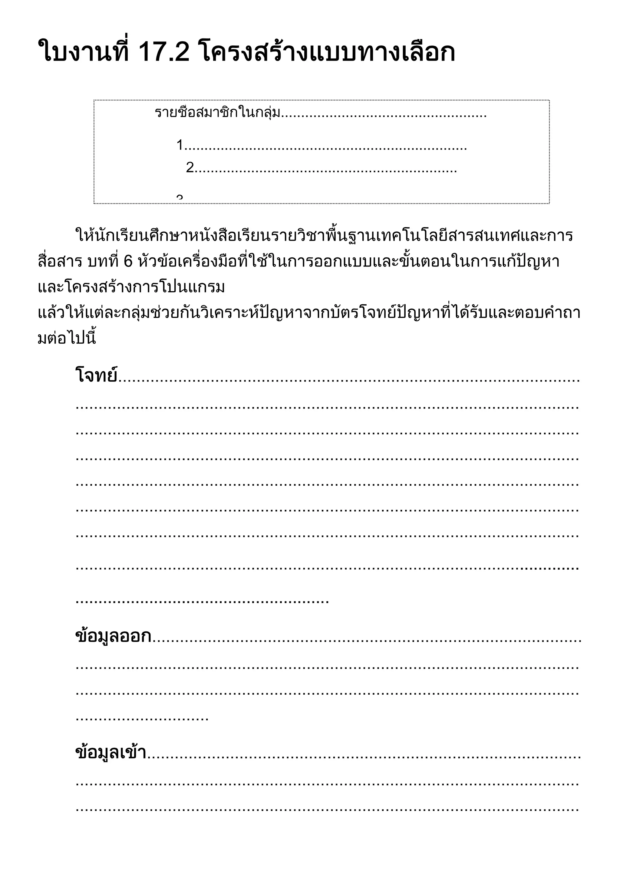 ใบงานที่ 17.2 โครงสร้างแบบทางเลือก<br/> รายชื่อสมาชิกในกลุ่ม...................................................1...................................................................... 2.................................................................3...................................................................... 4.................................................................<br />ให้นักเรียนศึกษาหนังสือเรียนรายวิชาพื้นฐานเทคโนโลยีสารสนเทศและการสื่อสาร บทที่ 6 หัวข้อเครื่องมือที่ใช้ในการออกแบบและขั้นตอนในการแก้ปัญหา และโครงสร้างการโปนแกรม แล้วให้แต่ละกลุ่มช่วยกันวิเคราะห์ปัญหาจากบัตรโจทย์ปัญหาที่ได้รับและตอบคำถามต่อไปนี้ <br />โจทย์......................................................................................................................................................................................................................................................................................................................................................................................................................................................................................................................................................................................................................................................................................................................................................................................................................................................................................................................................................<br />ข้อมูลออก....................................................................................................................................................................................................................................................................................................................................................<br />ข้อมูลเข้า...............................................................................................................................................................................................................................................................................................................................................................................................................................................................................................................................................................................................................................................................................................................................................................<br />ตัวแปรที่ใช้ (Variable)<br />................................................................................................................................................................................................................................................................................................................................................................................................................................................................................................................................................................................................................................................................................................................................................................<br />การประมวลผล<br /> รหัสลำลอง..........................................................................................................................................................................................................................................................................................................................................................................................................................................................................................................................................................................................................................................................................................................................................................................................................................................................................................................................................................................................................................................................................................................................................................................................................................................................................................................................................................................................................................................................................................................................................................................................<br />ผังงาน (flowchart)<br /> <br />ใบงานที่ 17.3 โครงสร้างแบบวนซ้ำ<br /> รายชื่อสมาชิกในกลุ่ม...................................................1............................................................