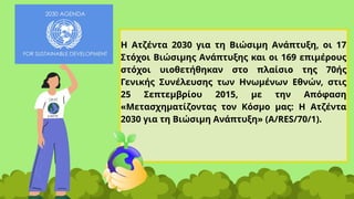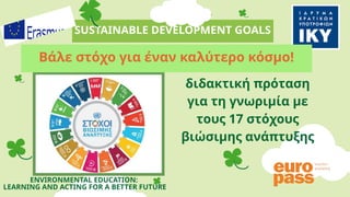 Μία παρουσίαση για μια διδακτική πρόταση με στόχο να γνωρίσουν οι μαθητές/μαθήτριες καλύτερα του; 17 στόχους βιώσιμης ανάπτυξης. Η παρουσίαση δημιουργήθηκε στα πλαίσια της διάχυσης τουτων αποτελεσμάτων του ευρωπαϊκού προγράμματος του 1ου Γυμνασίου Ελευθερίου-Κορδελιού Erasmus + KA122 "Εκπαιδεύοντας τους αυριανούς πολίτες σε ένα αειφόρο σχολείο με έμφαση στο περιβάλλον και στην απόκτηση δεξιοτήτων" και ειδικότερα του επιμορφωτικού σεμιναρίου "Environmental Education: Learning and Acting for a Better Future"