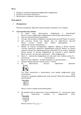 Документ описывает учебный план, направленный на раскрытие способов кодирования графической информации и развитие логического мышления учащихся. Он включает инструкции для самостоятельной работы с вопросами о представлении информации в компьютере, цветах и видеопамяти. В конце предусмотрена проверка понимания новоизученного материала.