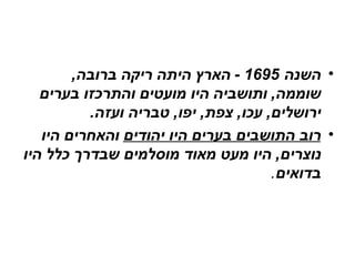 השנה 1695- הארץ היתה ריקה ברובה , שוממה , ותושביה היו מועטים והתרכזו בערים ירושלים , עכו , צפת , יפו , טבריה ועזה . רוב התושבים בערים היו יהודים והאחרים היו נוצרים , היו מעט מאוד מוסלמים שבדרך כלל היו בדואים .