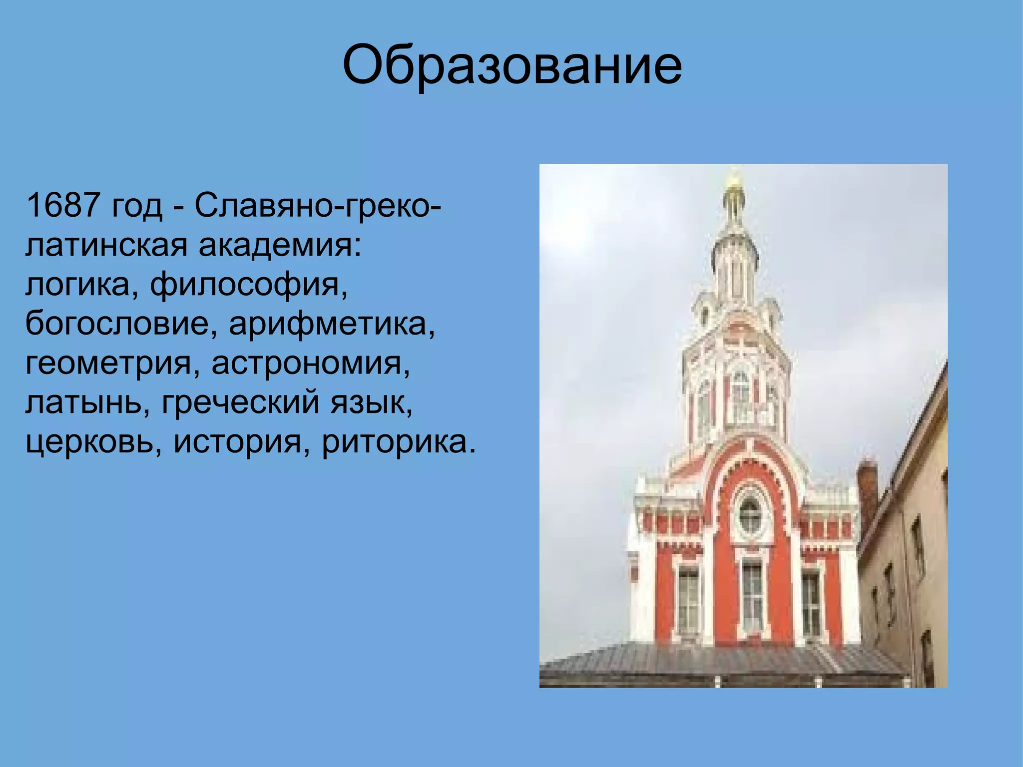 Документ описывает образование и культуру России в XVII веке, включая важные учебные заведения и книги того времени. Рассматриваются научные направления, такие как история, география и литература, а также архитектурные достижения и иконопись. Упоминаются конкретные примеры работ и изданий, иллюстрирующие развитие знаний и искусства в эту эпоху.