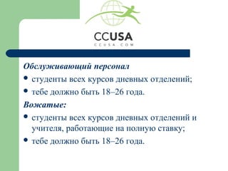 Документ описывает участие студентов и молодых преподавателей в международной программе CCUSA, охватывающую различные типы лагерей. Участниками могут быть студенты и преподаватели в возрасте 18–26 лет, что предоставляет возможности для работы, культурного обмена и изучения английского языка. Программа предлагает значимый опыт, который может стать ценным в резюме, а также возможность путешествий по США.