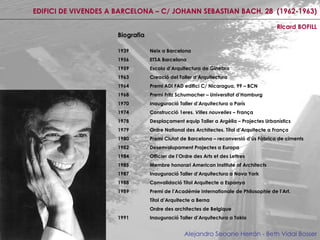 EDIFICI DE VIVENDESA BARCELONA – C/ JOHANN SEBASTIAN BACH, 28 (1962-1963) Ricard BOFILL Alejandro Seoane Herrán - Beth Vidal Bosser Biografia 1939 Neix a Barcelona 1956 ETSA Barcelona 1959 Escola d’Arquitectura de Ginebra 1963 Creació del Taller d’Arquitectura 1964 Premi ADI FAD edifici C/ Nicaragua, 99 – BCN 1968 Premi Fritz Schumacher – Universitat d’Hamburg 1970 Inauguració Taller d’Arquitectura a París 1974 Construcció 1eres. Villes nouvelles – França 1978 Desplaçament equip Taller a Argèlia – Projectes Urbanístics 1979 Ordre National des Architectes. Títol d’Arquitecte a França 1980 Premi Ciutat de Barcelona – reconversió d’ús Fàbrica de ciments 1982 Desenvolupament Projectes a Europa 1984 Officier de l’Ordre des Arts et des Lettres 1985 Membre honorari American Institute of Architects 1987 Inauguració Taller d’Arquitectura a Nova York 1988 Convalidació Títol Arquitecte a Espanya 1989 Premi de l’Académie Internationale de Philosophie de l’Art. Títol d’Arquitecte a Berna Ordre des architectes de Belgique 1991 Inauguració Taller d’Arquitectura a Tokio