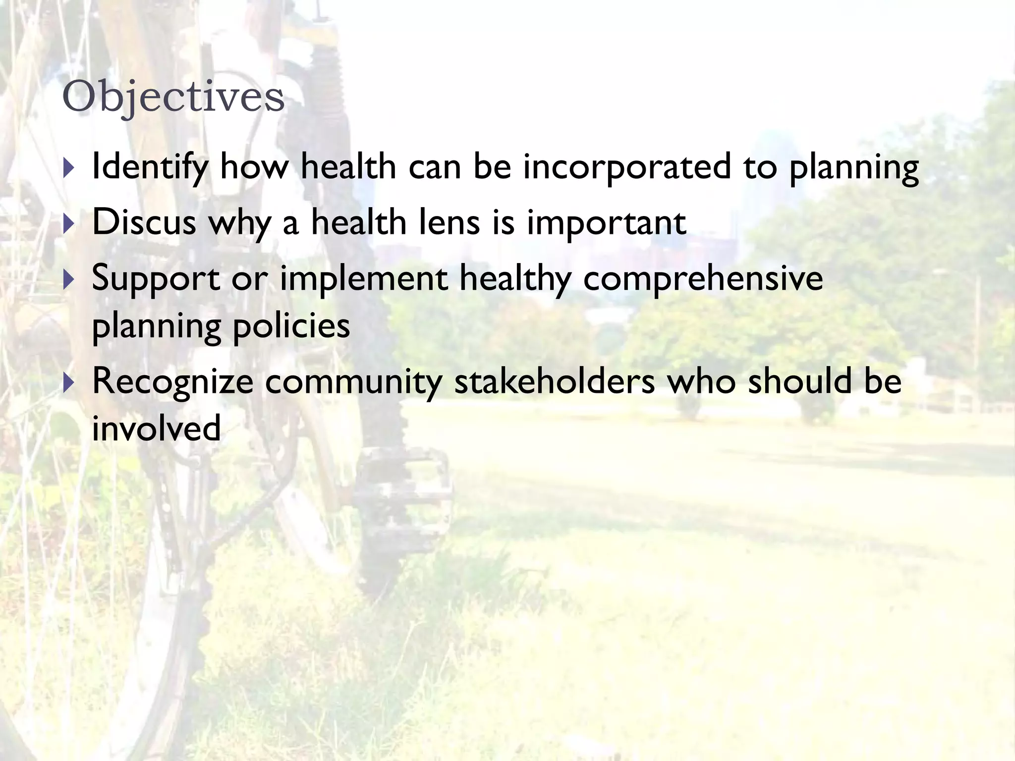 This document discusses incorporating health considerations into city comprehensive planning. It identifies key elements like land use, transportation, and housing that impact health. It also notes troubling obesity rates. Case studies from cities in Washington that integrated health are provided, with lessons learned around focusing on aging populations, allowing flexibility, and using multidisciplinary teams. Resources for further information are included.