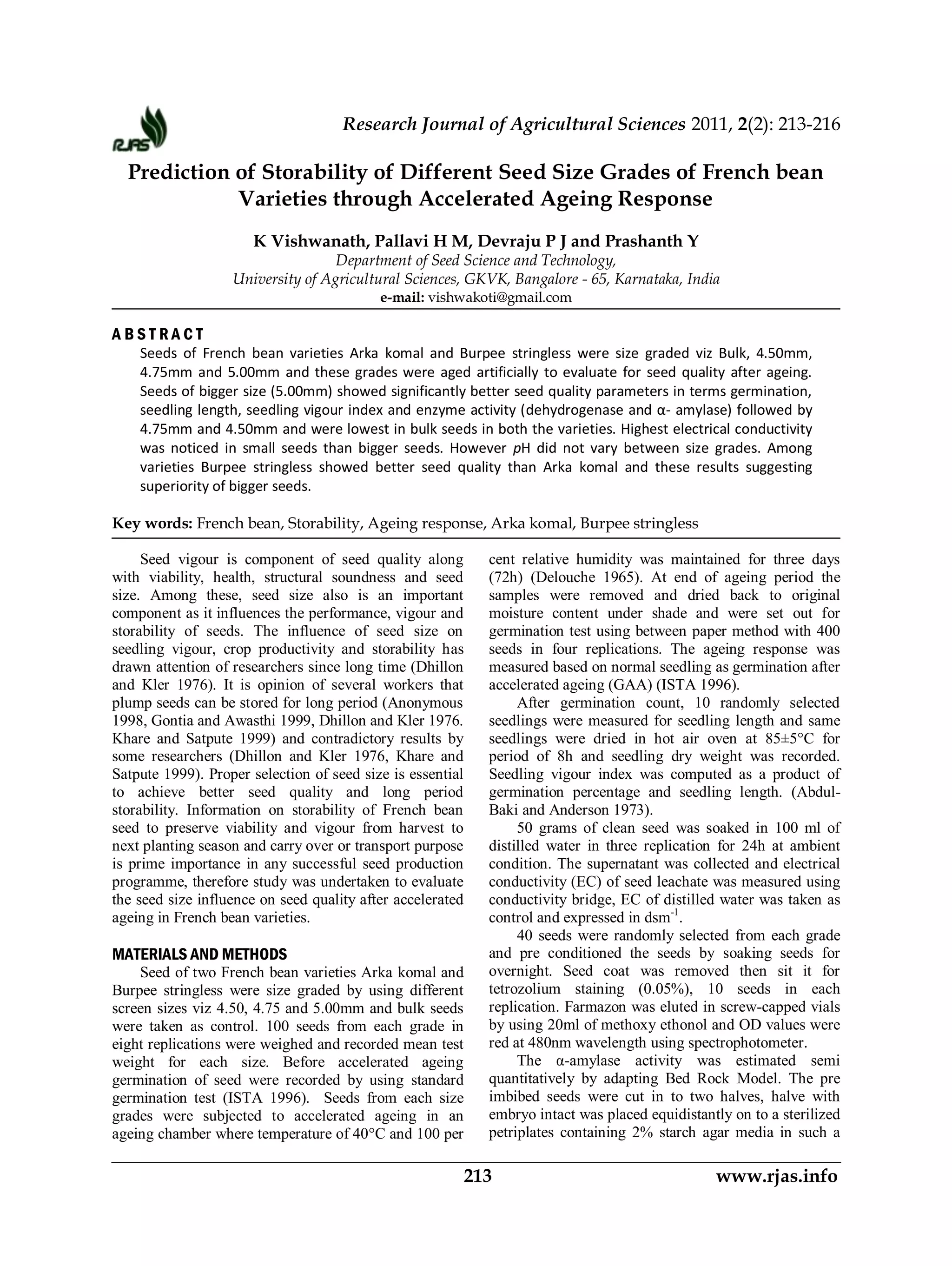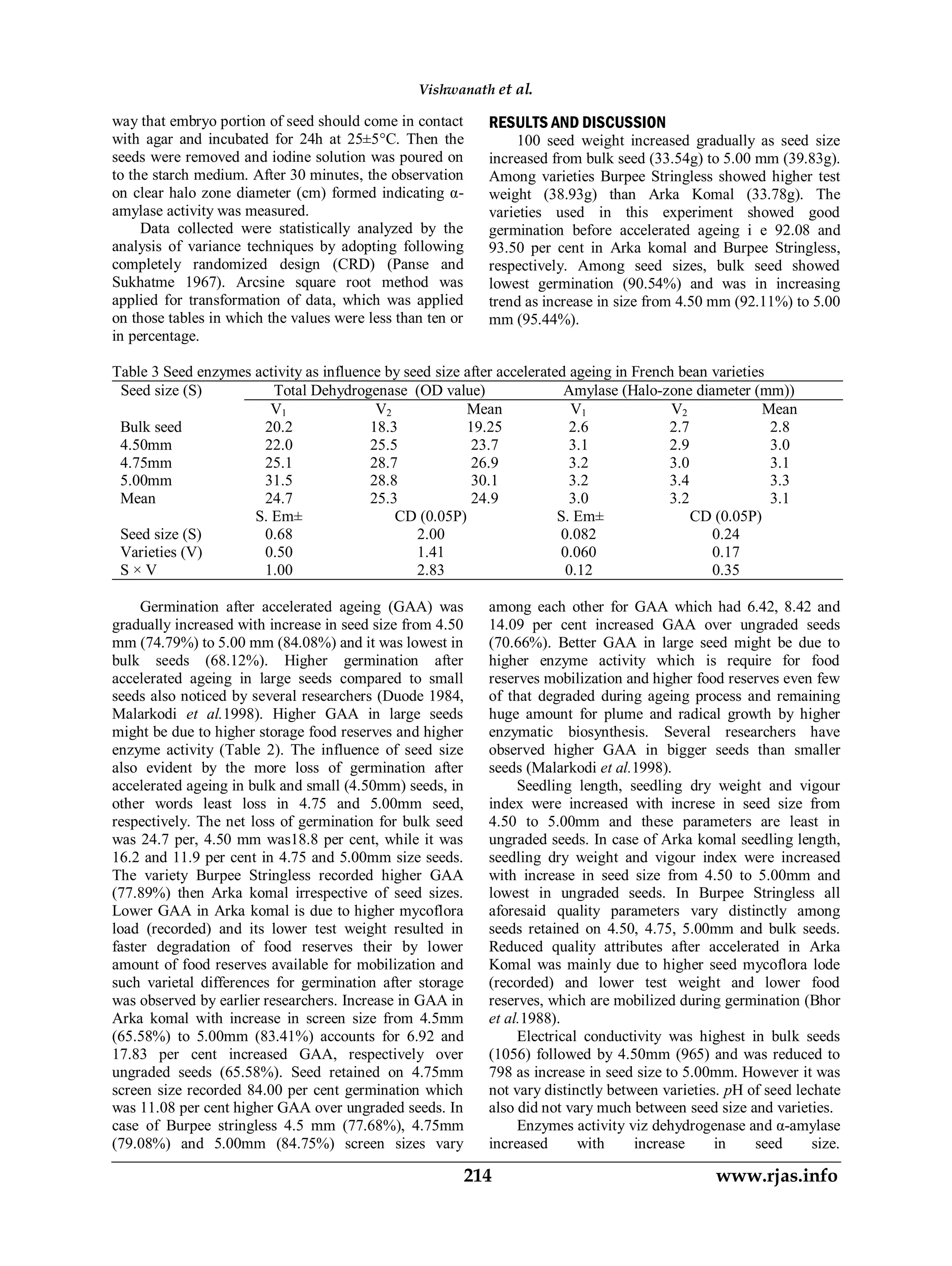 This study evaluated the effect of seed size on seed quality parameters in two French bean varieties after artificial aging. Seeds were graded into sizes of bulk, 4.50mm, 4.75mm, and 5.00mm. Larger seeds of 5.00mm showed significantly better germination, seedling length, vigor index, and enzyme activity compared to smaller seeds after aging. The highest electrical conductivity was found in smaller seeds. Both varieties showed improved seed quality with increasing seed size, with Burpee stringless performing better overall. Larger seeds demonstrated superior storability and quality maintenance after aging.