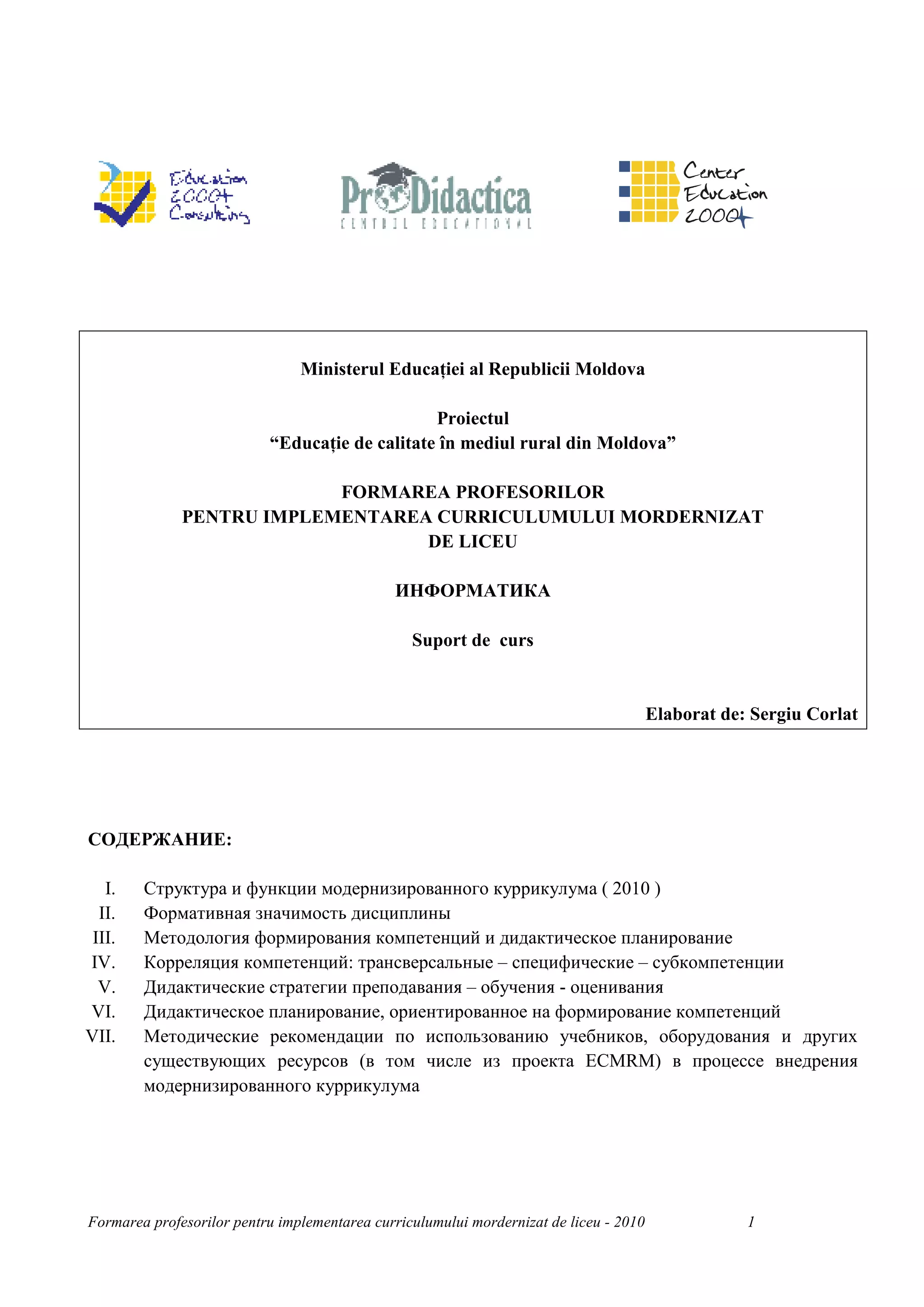 Документ описывает проект формирования качества образования в сельской местности Молдовы, включая структуру и функции модернизированного куррикулума для преподавателей информатики. Он акцентирует внимание на методах преподавания и формирования компетенций студентов, а также на взаимосвязи ключевых, специфических и субкомпетенций в образовательном процессе. Целью проекта является подготовка учеников к современным требованиям информационного общества и воспитание ответственных граждан.
