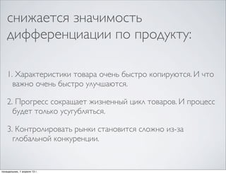 Документ обсуждает изменение значимости дифференциации товаров и услуг на рынке, подчеркивая, что характеристики продуктов быстро копируются, улучшая услугу как важный аспект конкурентоспособности. Основные этапы создания каналов продаж включают понимание потребностей клиентов и быструю адаптацию концепции на основе результатов. Также рассматривается эволюция подхода к продажам с акцентом на клиентский сервис и органзацию рабочих процессов.