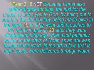 The document discusses the theological implications of 1 Peter 3:18-22, highlighting Christ’s sacrifice and its uniqueness compared to other faiths. It argues that Christians, Jews, and Muslims do not worship the same God because the acceptance of Christ's deity and his role as the Savior is essential for true worship. Additionally, it presents the preaching of Christ to imprisoned spirits as a declaration of victory over sin and evil, emphasizing the significance of baptism as a spiritual pledge to God.