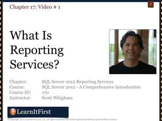 The document outlines a comprehensive course on SQL Server 2012 Reporting Services (SSRS), detailing its features, installation, and reporting capabilities. It discusses various aspects, including data sources, report creation, and delivery methods, while also highlighting the architecture of SSRS and its integration with other services. Additionally, it mentions the course structure and what participants can expect to learn.
