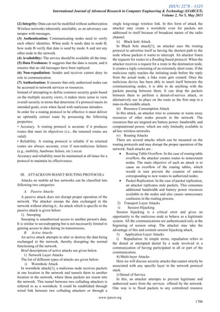 This document discusses security challenges in mobile ad hoc networks (MANETs) and reviews several secure routing protocols proposed to address these challenges. It begins by introducing MANETs and explaining that routing in MANETs is difficult due to the dynamic topology. It then discusses common security goals for routing protocols like confidentiality, integrity, and availability. Several attacks on MANET routing protocols are described, including passive attacks like eavesdropping and active attacks like wormhole and blackhole attacks. The document proceeds to review six secure routing protocols for MANETs - DSDV, SAR, SAODV, SRP, Secure AODV using RSA signatures, and TORA - and describes their approaches to providing routing security. It concludes