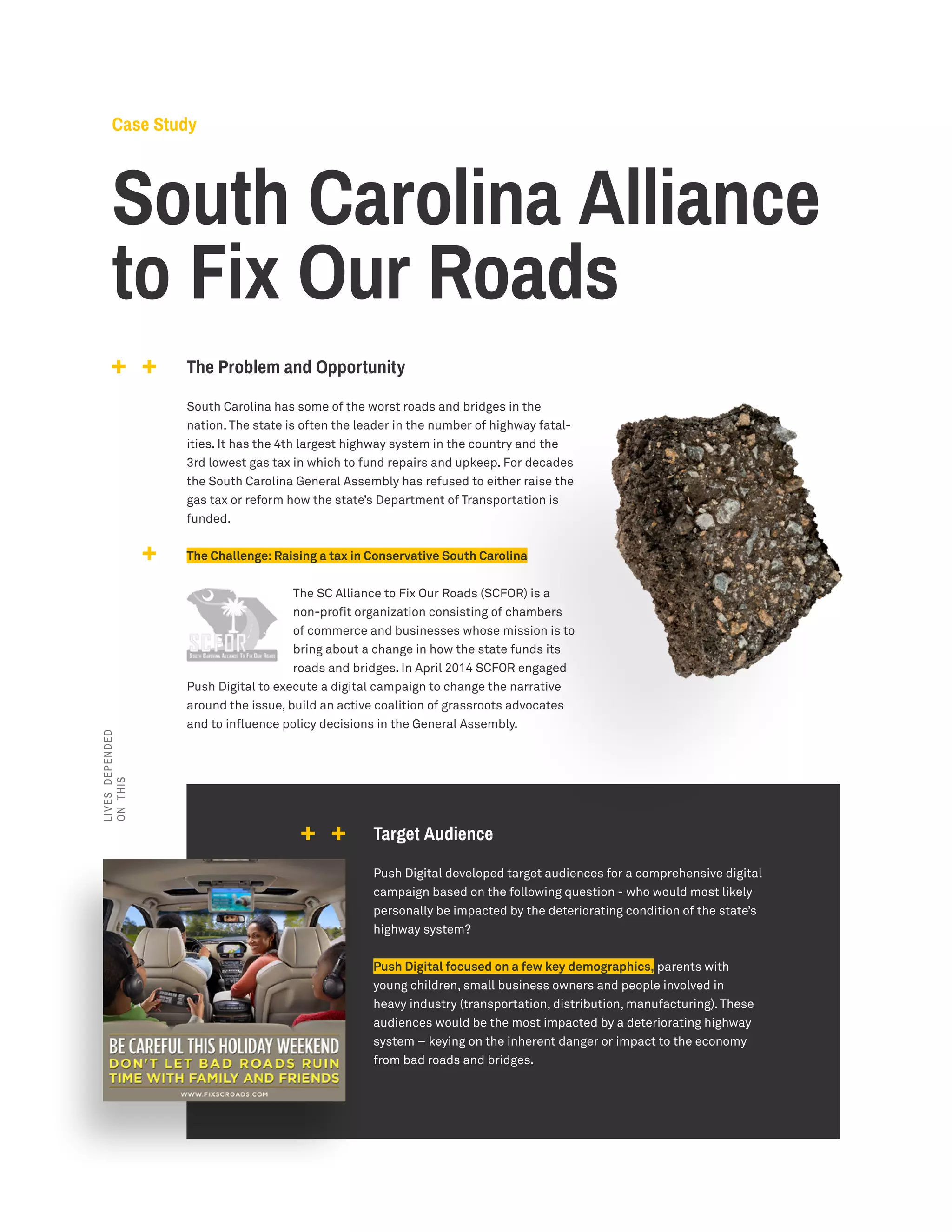 The South Carolina Alliance to Fix Our Roads (SCFOR) engaged Push Digital to lead a digital advocacy campaign to build support for increasing funding for roads and bridges in South Carolina. Push Digital developed targeted messaging and used social media, advertising, and grassroots engagement to shift roads funding from a low priority issue to the top issue for voters and legislators. Over three years and through multiple legislative proposals, the campaign grew engagement, applied pressure to lawmakers, and evolved its messaging. Ultimately, this led to the passage of new roads funding legislation, the first significant increase in 30 years, demonstrating the power of digital advocacy.