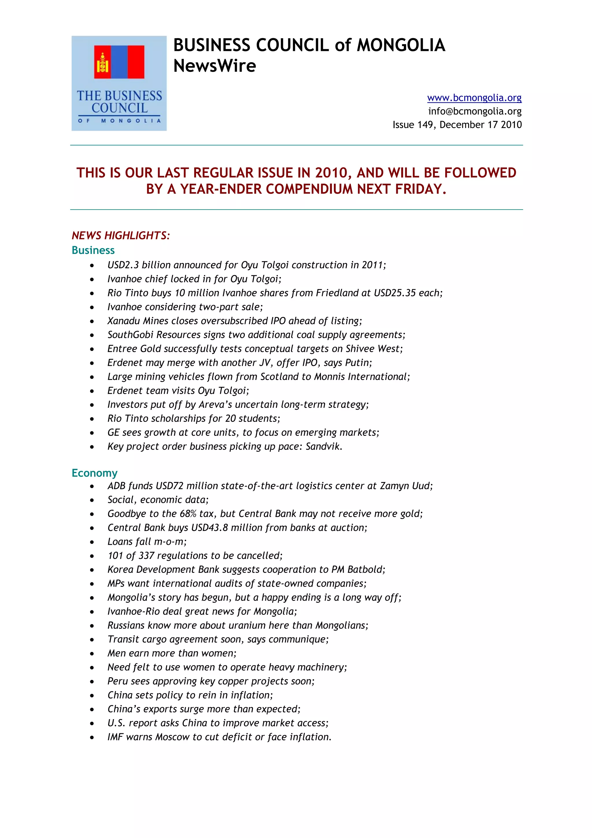 The document summarizes the latest news from the Business Council of Mongolia. It discusses that USD2.3 billion has been approved for construction of the Oyu Tolgoi project in 2011, which will be the peak year of construction. It also mentions that first ore delivery to the concentrator is targeted to be 6 months earlier than planned, in late 2012. Additionally, it provides details on the principal elements of the 2011 construction program and budget for Oyu Tolgoi totaling USD3.5 billion.