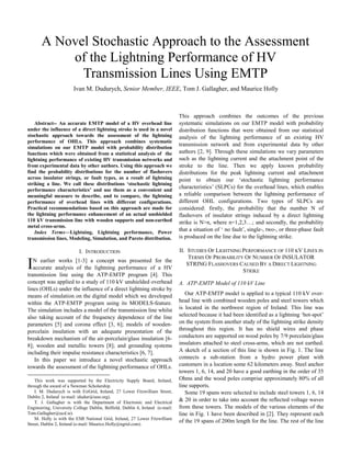 This document presents a novel stochastic approach for assessing the lightning performance of overhead transmission lines (OHLs). It combines systematic simulations using an accurate EMTP model of a 110 kV OHL with probability distribution functions obtained statistically. The probabilities of different outcomes, like the number of insulator string flashovers from a direct lightning strike, are calculated. These "stochastic lightning performance characteristics" provide a meaningful way to compare the lightning performance of different OHL configurations. The approach is demonstrated through simulations of a 110 kV line in Ireland that had experienced lightning issues.