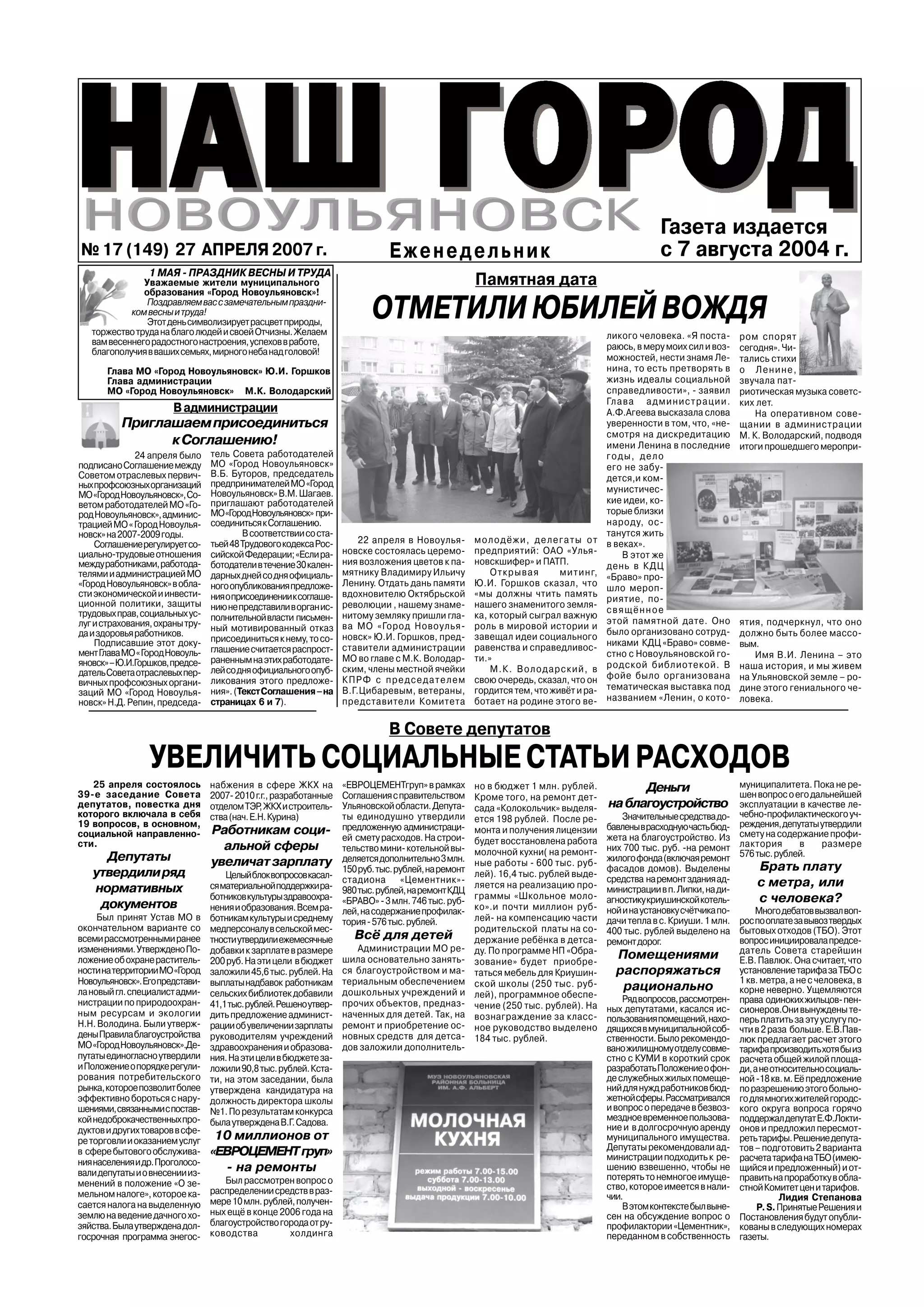 Документ представляет собой информацию о праздновании Дня весны и труда в Новоульяновске, включая официальные поздравления и поздравления от местных властей. Также обсуждаются соглашения между работодателями и профсоюзами, направленные на улучшение условий труда и социальных гарантий. В нем упоминается множество мероприятий и событий, направленных на поддержку местной молодежи и развитие города.