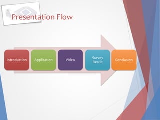 This document discusses RFID (radio frequency identification) technology, including its components, types of tags, and applications. The key components of an RFID system are RFID tags/inlays containing chips and antennas, readers/antennas, and application software. There are three main types of tags: passive tags which have no power source, semi-passive tags with batteries, and active tags with longer read ranges. Common applications mentioned include credit cards, electronic toll collection, supply chain/logistics tracking, and access control. The document also references an online survey about opinions on RFID and its further potential uses.