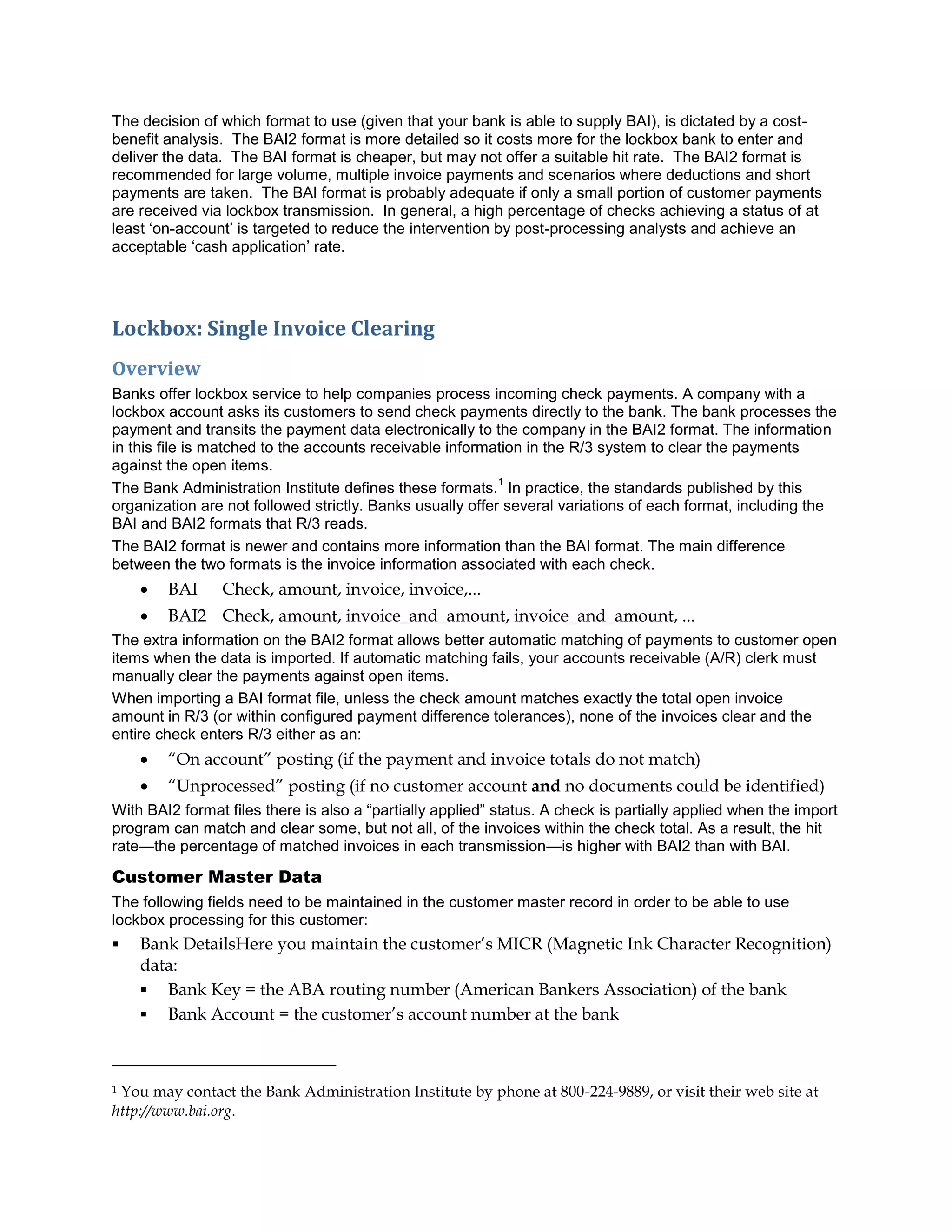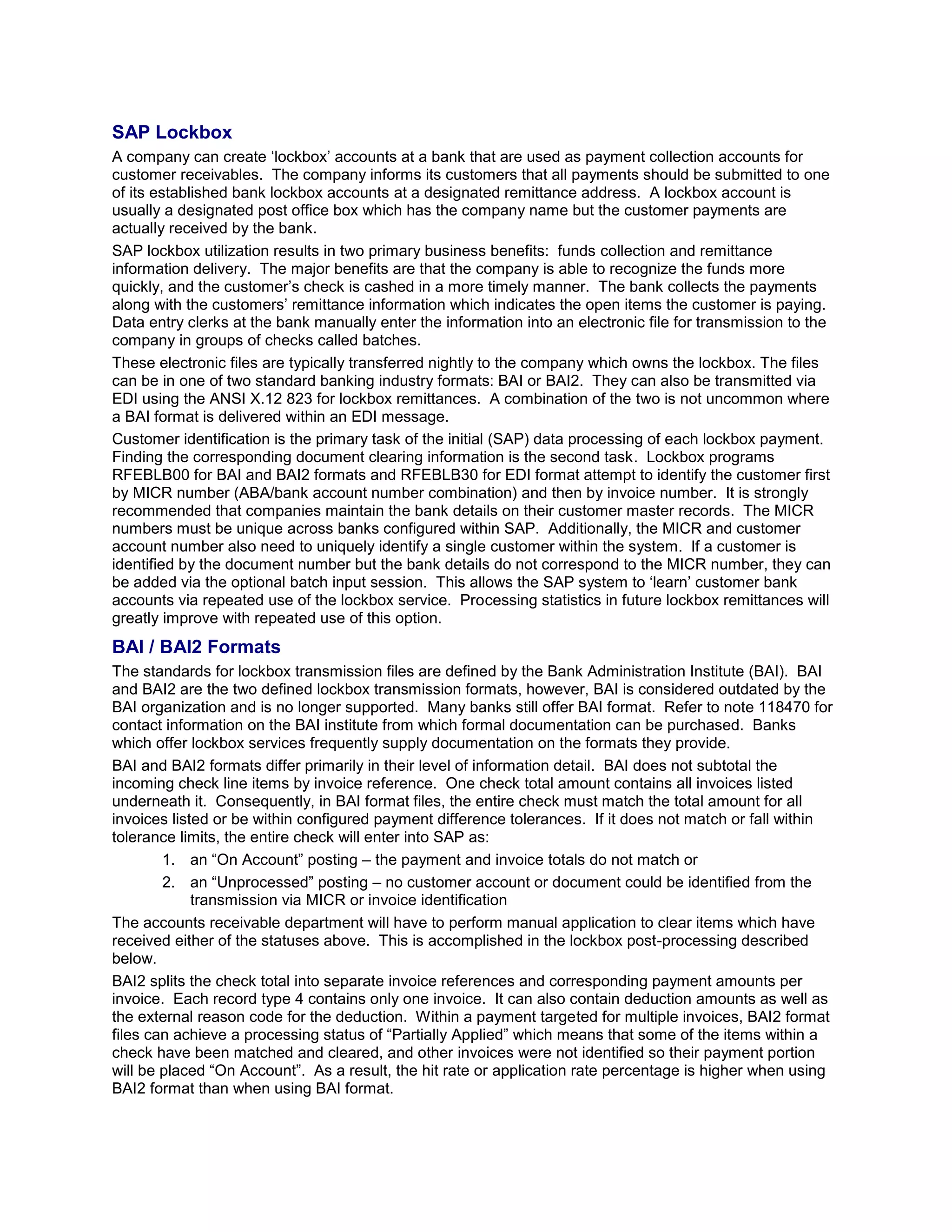 - Maintaining accurate customer and bank details in SAP enables automated matching of payments to invoices, reducing manual work. Files in the more detailed BAI2 format generally have higher matching rates.
