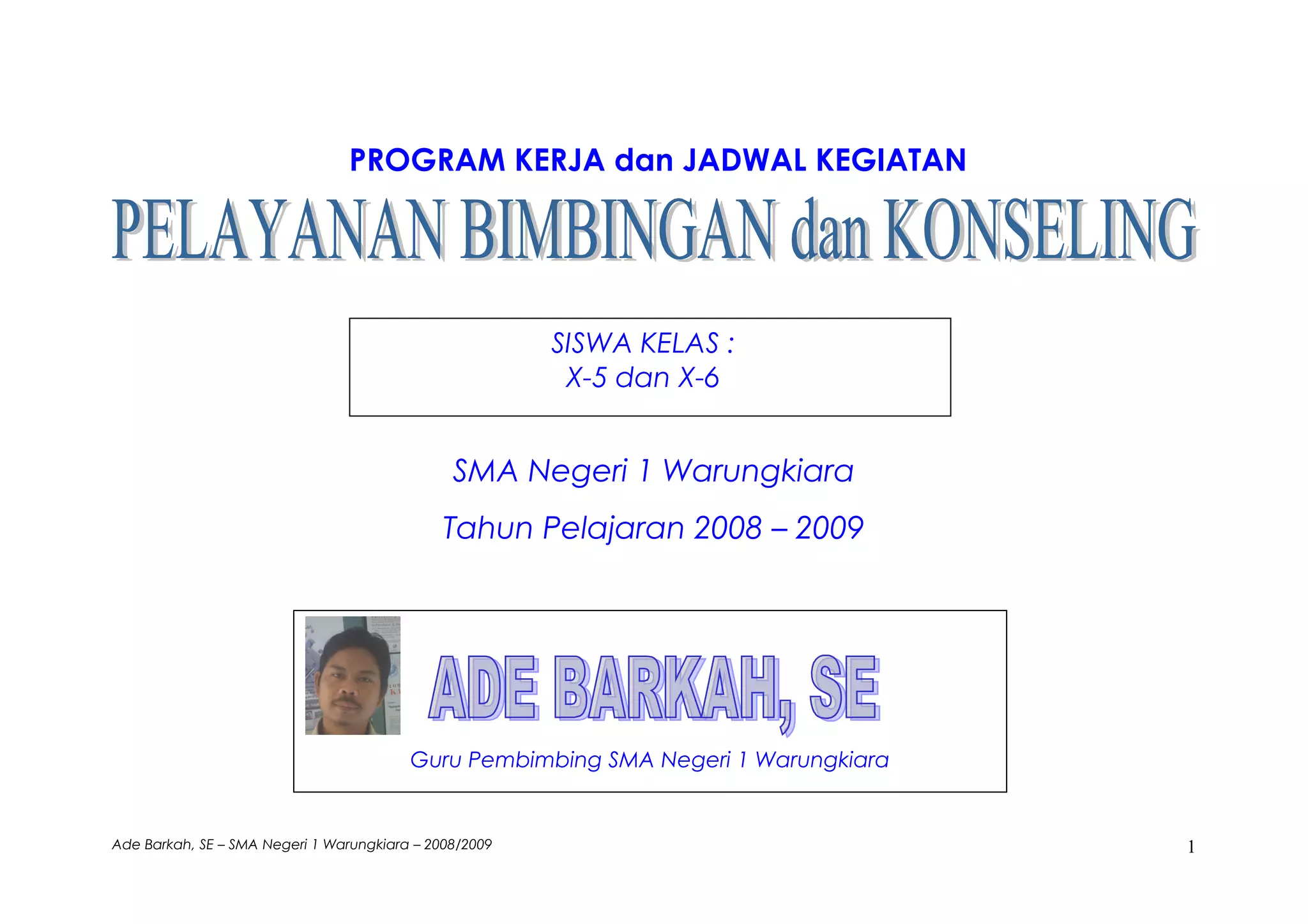 Dokumen ini menjelaskan program kerja dan jadwal kegiatan bimbingan dan konseling di SMA Negeri 1 Warungkiara untuk tahun pelajaran 2008-2009. Fokus utamanya adalah mengembangkan kemandirian dan kompetensi siswa melalui berbagai jenis layanan bimbingan yang sesuai dengan norma dan prinsip pendidikan. Tujuan dari program ini adalah membantu siswa mencapai kematangan dalam aspek pribadi, sosial, belajar, dan karir.