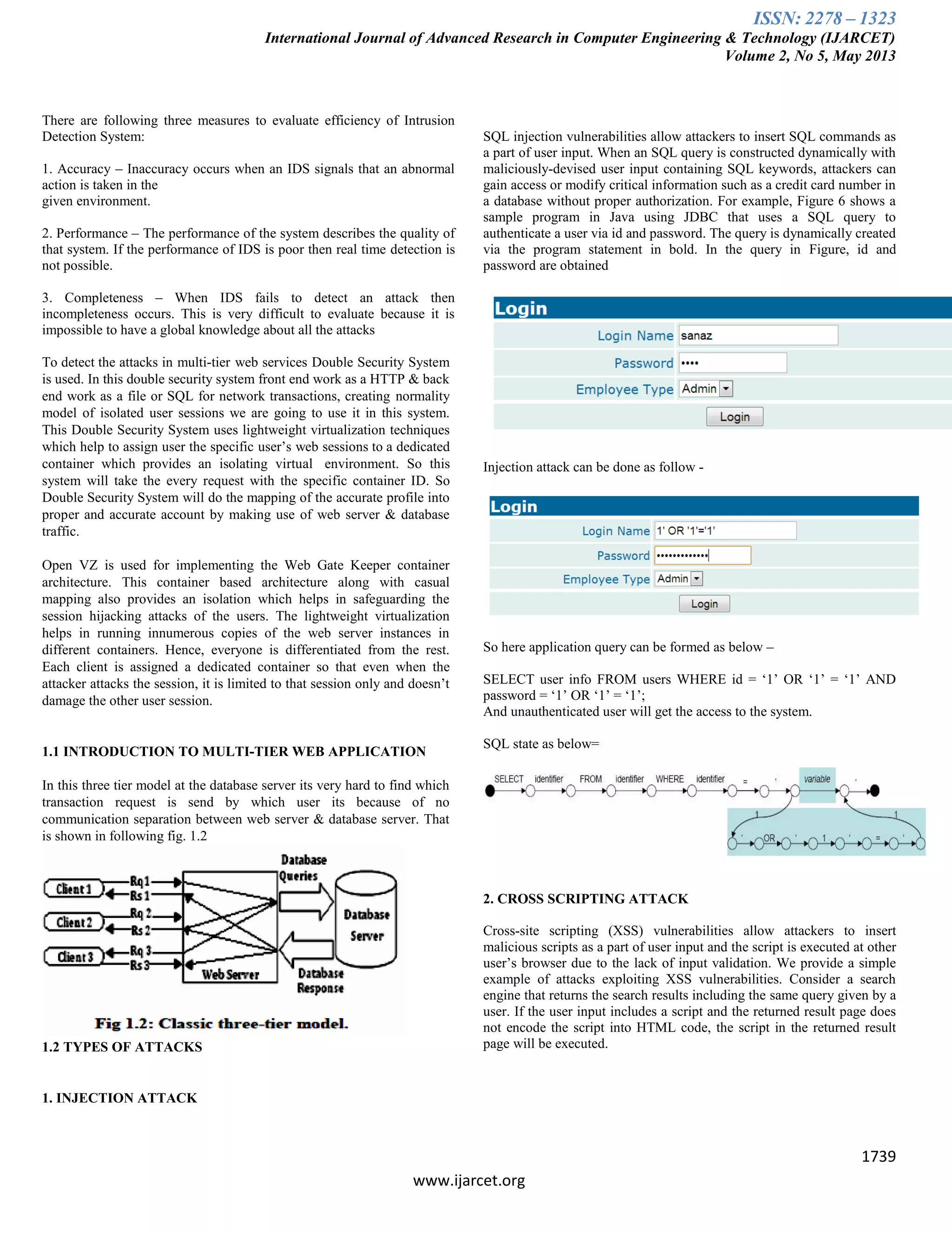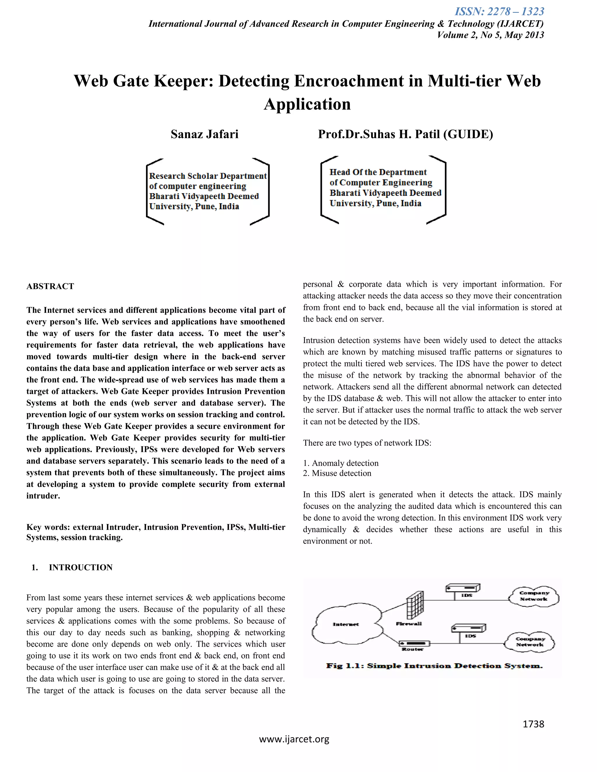 This document describes a system called Web Gate Keeper that provides intrusion prevention for multi-tier web applications. Web Gate Keeper tracks user sessions and controls access across the web server and database server tiers to prevent various types of attacks. It uses container virtualization to isolate each user's session. This prevents attacks like privilege escalation, session hijacking, SQL injection, cross-site scripting, and direct database attacks. The system architecture involves processing all requests through a servlet filter for session validation before dispatching to the application. It detects intrusions and notifies administrators.