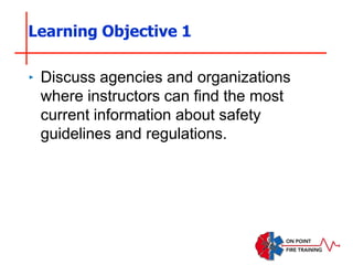 This document discusses safety guidelines and regulations that instructors should follow when planning training, with a focus on live-fire training using acquired structures. It identifies organizations that establish safety standards like OSHA and NFPA. Instructors must inspect acquired structures according to NFPA 1403 before conducting live-fire training to ensure safety. Live-fire training requires strict safety protocols and only structures that can be made entirely safe based on their condition are suitable. Instructors must also obtain necessary permits and owner permission before conducting live-fire training in an acquired structure.