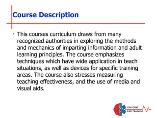 The document outlines the ninth edition of the fire and emergency services instructor course, which focuses on teaching methods, adult learning principles, and measuring teaching effectiveness. It includes detailed job performance requirements aligned with national standards and covers essential topics such as lesson planning, instructional techniques, classroom management, and assessment strategies. Each chapter presents specific learning objectives and outcomes, ensuring that instructors are well-equipped to deliver effective training in fire and emergency services.