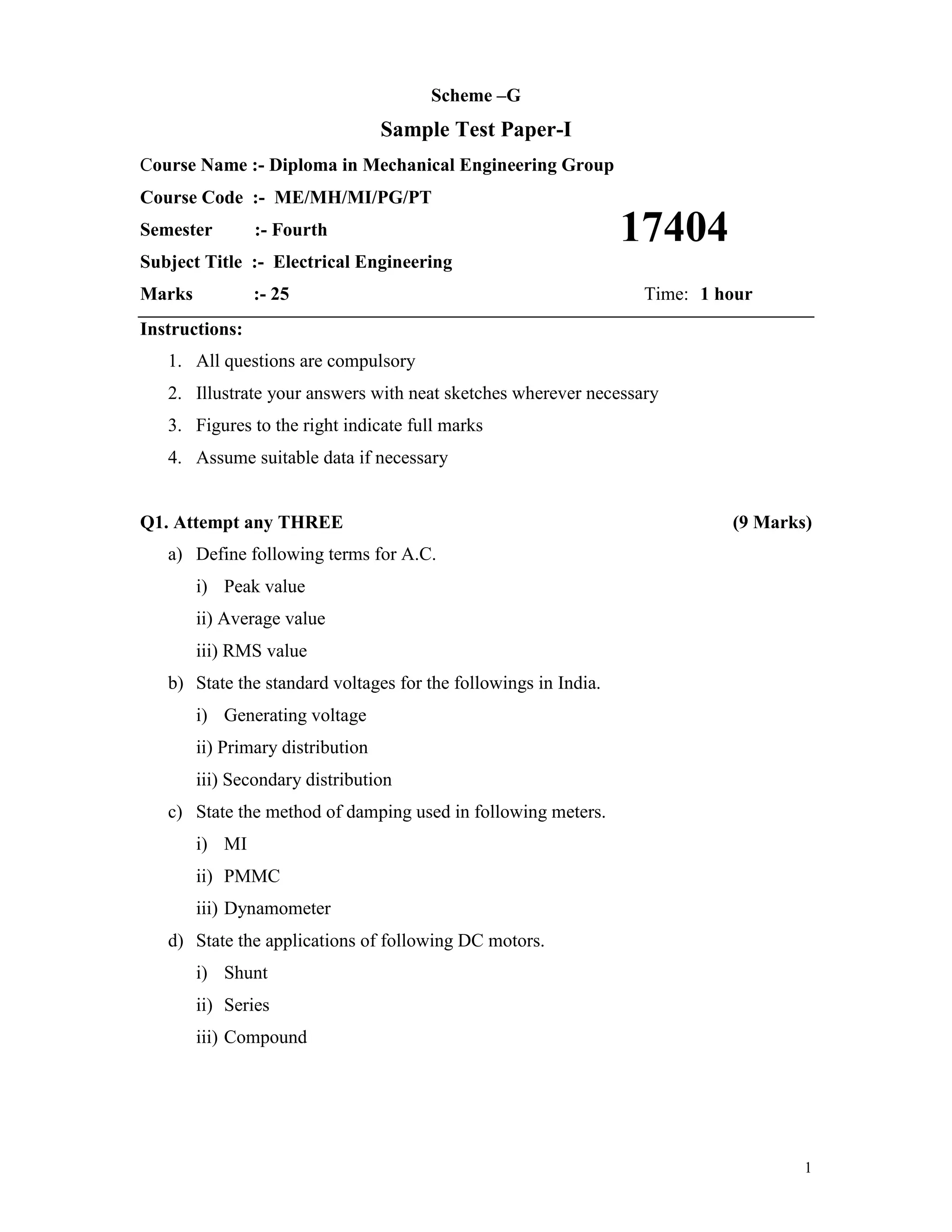 1) The document contains a sample test paper for an electrical engineering course with 6 questions covering topics such as AC circuits, transformers, motors, and more.