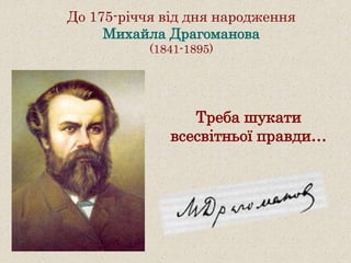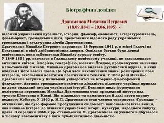 18 вересня 2016 р. виповнюється 175 років від дня народження М.П.Драгоманова – видатного українського публіциста, вченого, громадського діяча, представника відомого українського роду Драгоманових. Цій події присвячена мультимедійна презентація про життєвий і творчий шлях Михайла Драгоманова, що підготовлена відділом зв’язків з громадськістю і реклами ОННБ (автор – Анна Темнюк).