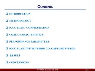 This document presents a techno-economic analysis of an air-blown integrated gasification combined cycle (IGCC) power plant with a hybrid CO2 capture system. The analysis evaluates the plant's performance parameters, including energy and exergy efficiencies, with and without CO2 capture. It finds that CO2 capture reduces the plant's energy efficiency by around 11.7% points. The highest energy losses during CO2 capture occur in the reboiler, which accounts for 45% of total capture losses. The levelized cost of electricity is estimated to increase from INR 3.33/kWh without capture to INR 5.21/kWh with the hybrid capture system.