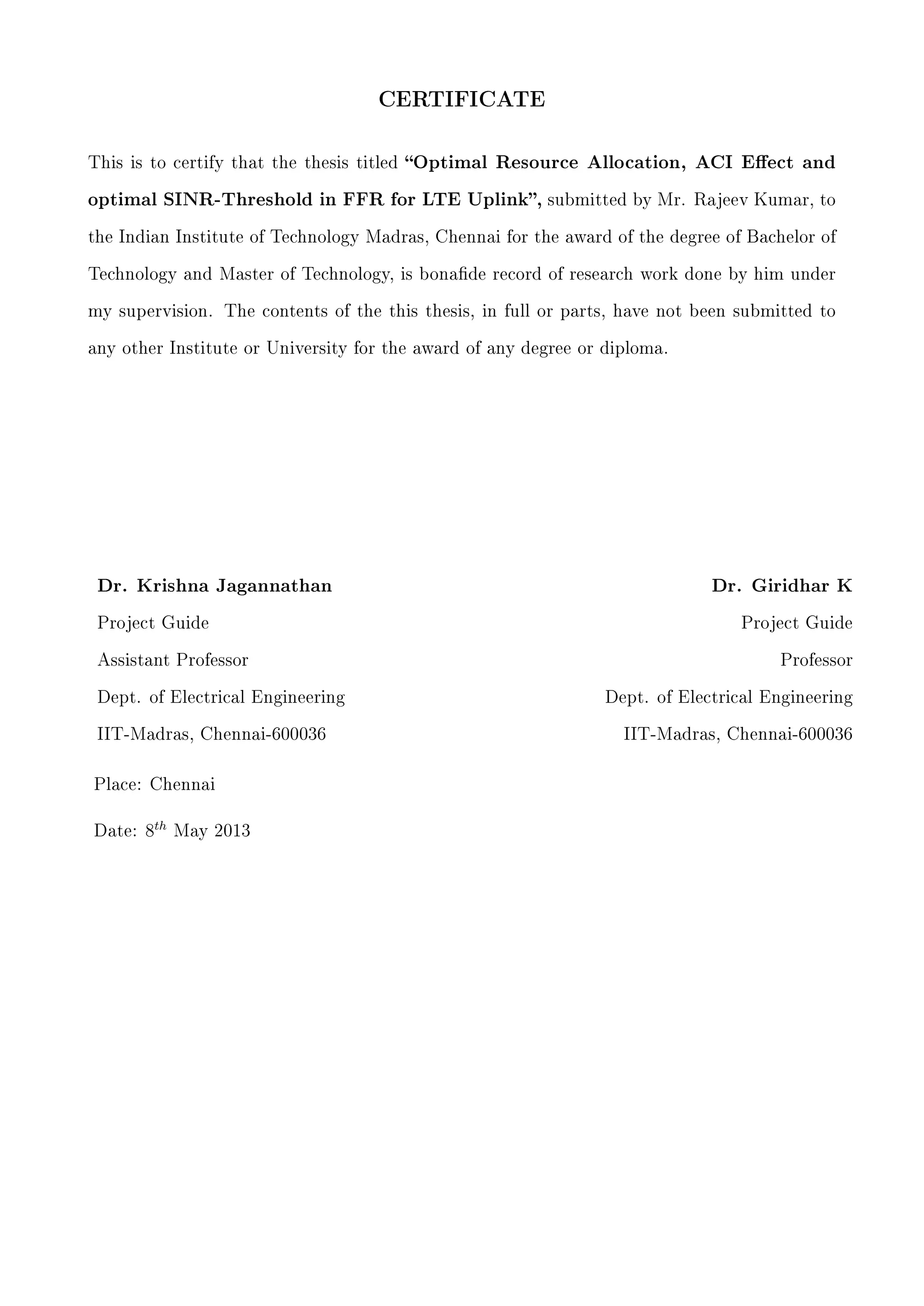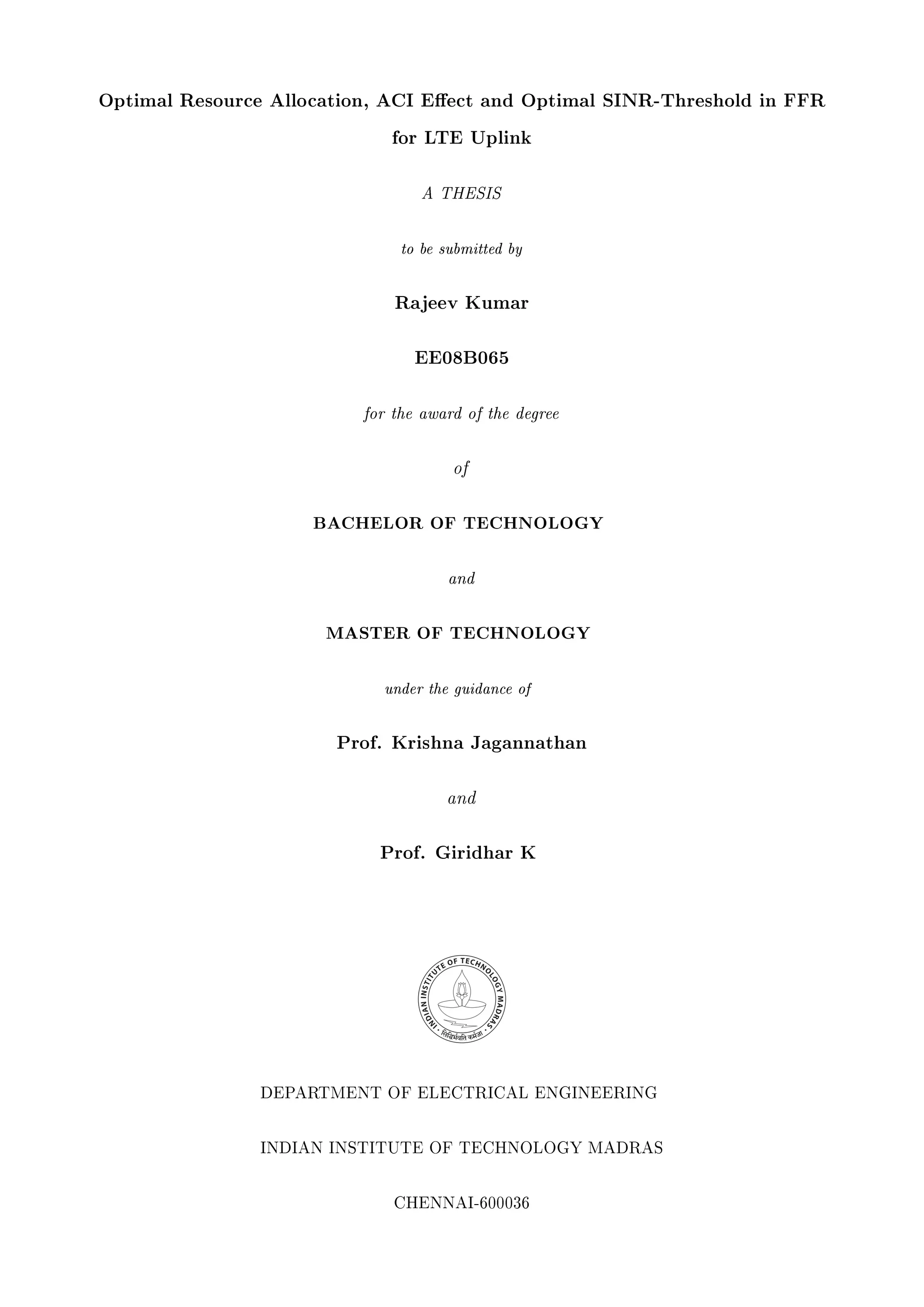 This document is a thesis submitted by Rajeev Kumar to the Indian Institute of Technology Madras for the award of Bachelor of Technology and Master of Technology degrees. The thesis investigates optimal resource allocation, adjacent channel interference effect, and optimal SINR-threshold in fractional frequency reuse for LTE uplink. It presents optimal and suboptimal resource allocation algorithms for SC-FDMA systems and evaluates their performance with and without considering adjacent channel interference. It also studies fractional frequency reuse and soft frequency reuse techniques for inter-cell interference mitigation and optimizes the fractional frequency reuse scheme. Simulation results are presented to evaluate the different algorithms and interference mitigation techniques.