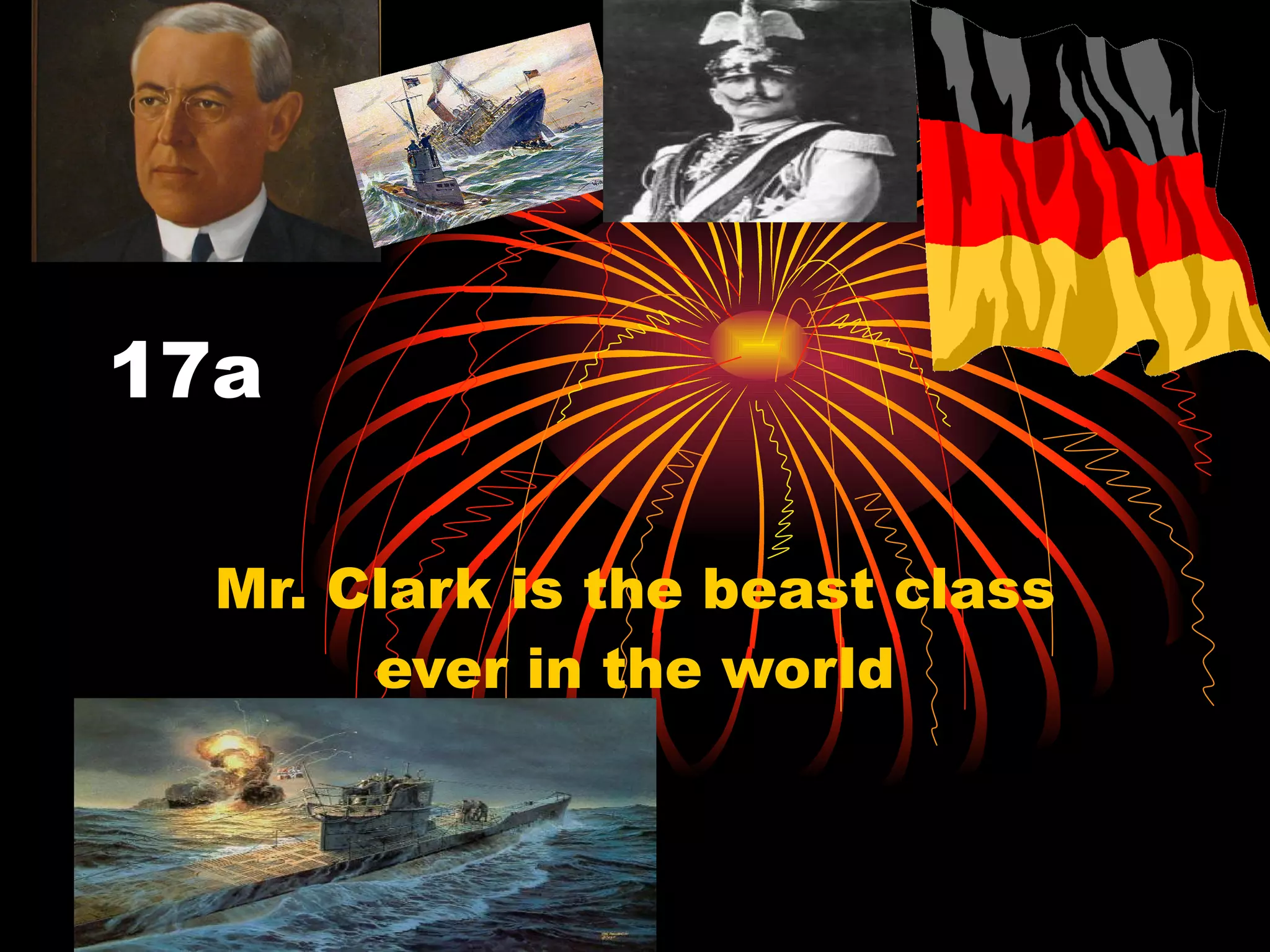 Mr. Clark is considered the best class ever. World War 1's president of the United States was Woodrow Wilson. Germany's leader at the time was Kaiser Wilhelm II and the war ended in 1918 with Germany's defeat.