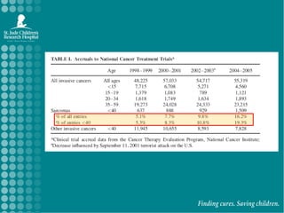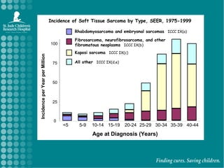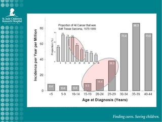 The document discusses soft tissue sarcomas (STS) in adolescents and young adults, highlighting the relative frequencies, histologic subtypes, treatment approaches, and survival outcomes for specific types, particularly rhabdomyosarcoma (RMS). It emphasizes the challenges in clinical trial enrollment and the need for collaboration between adult and pediatric oncology to improve treatment efficacy and outcomes. The piece addresses the importance of targeted therapies and ongoing research efforts to enhance understanding and treatment of these cancers.