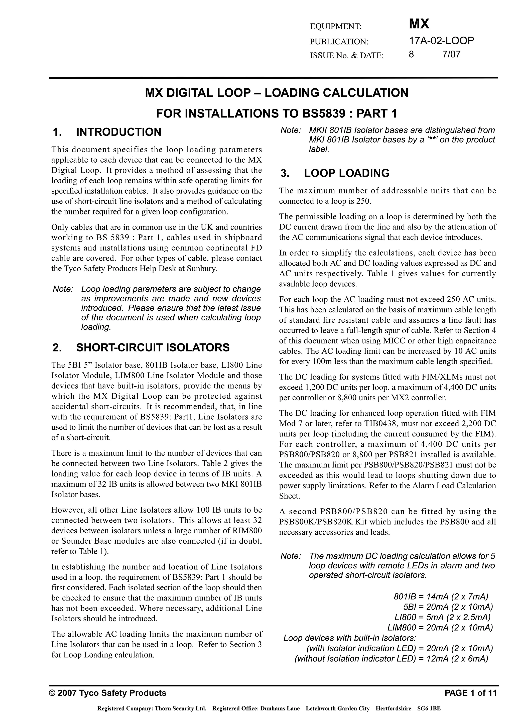 This document provides guidance on calculating loading for devices connected to an MX Digital Loop installation. It specifies the loading parameters for each device in terms of DC and AC units. The maximum number of devices per loop is 250. The document provides limits for DC and AC loading and guidance on using short-circuit isolators. It also provides a table of loading values for each device type to allow calculation of total loop loading.
