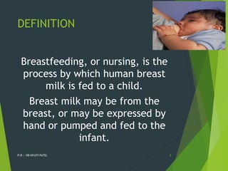 The document discusses breastfeeding, detailing its definition, mechanisms, and benefits for both baby and mother. It outlines various breastfeeding positions and techniques for successful latching and addresses common problems encountered during breastfeeding. Additionally, it highlights the nutritional advantages of breast milk and the importance of initiating breastfeeding shortly after delivery.