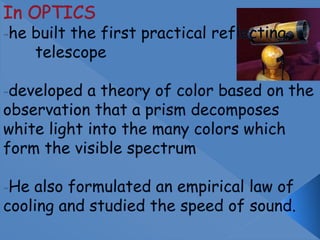 - Advancements in fields like astronomy, physics, and mathematics through inventions like the telescope and discoveries in mechanics, projective geometry, and analytic geometry.