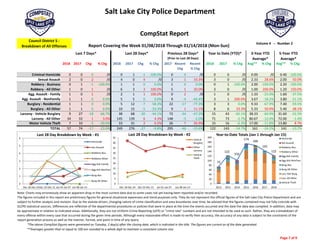 This document summarizes crime statistics from the Salt Lake City Police Department. It shows crime data from 2018 compared to 2017, as well as monthly crime numbers from 2012 to 2018. The statistics cover various types of crimes such as homicide, sexual assault, robbery, aggravated assault, burglary, larceny, and motor vehicle theft. The data provides preliminary figures that are subject to ongoing analysis and revision.