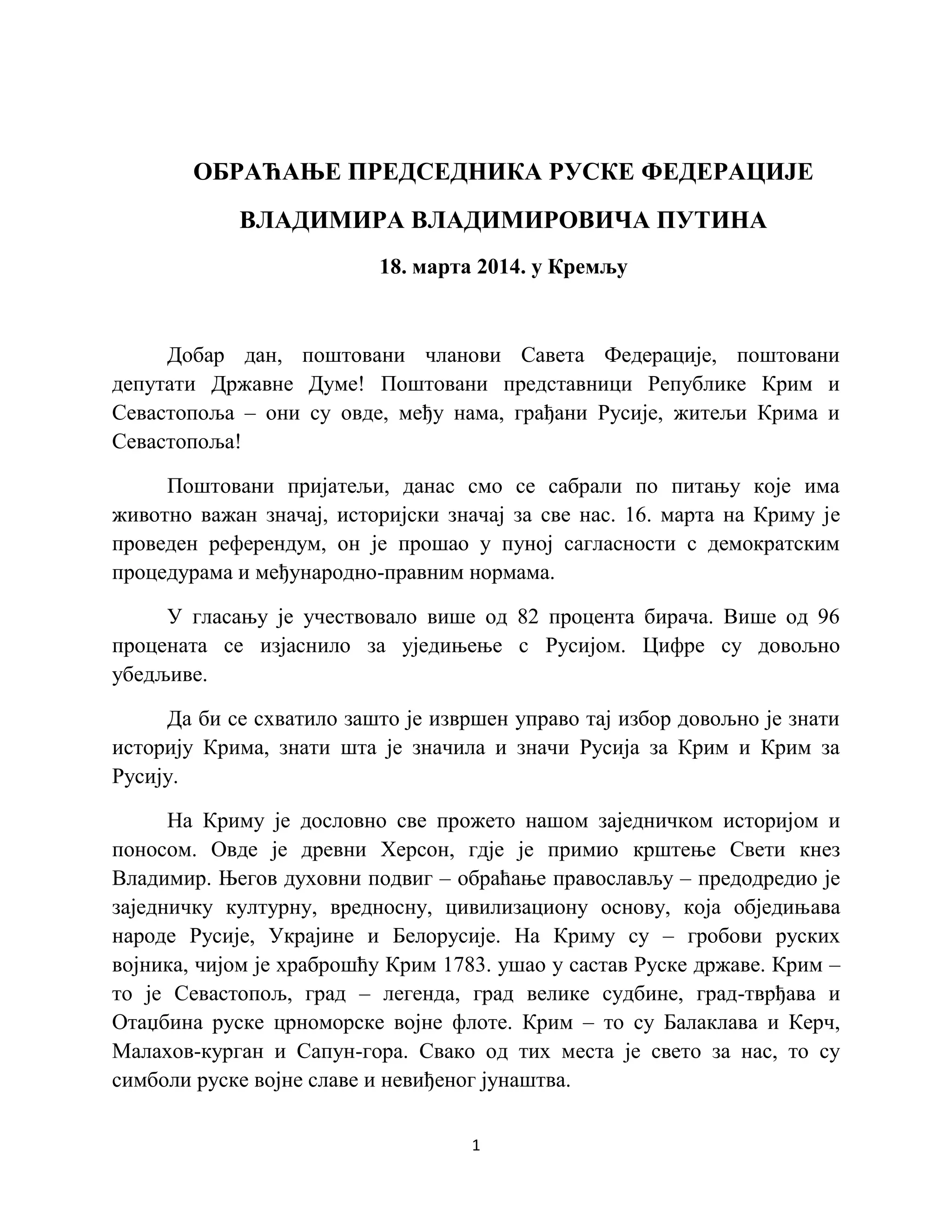 Думе! Грађани Русије, житељи Крима и Севастопоља!Данас, ослањајући се